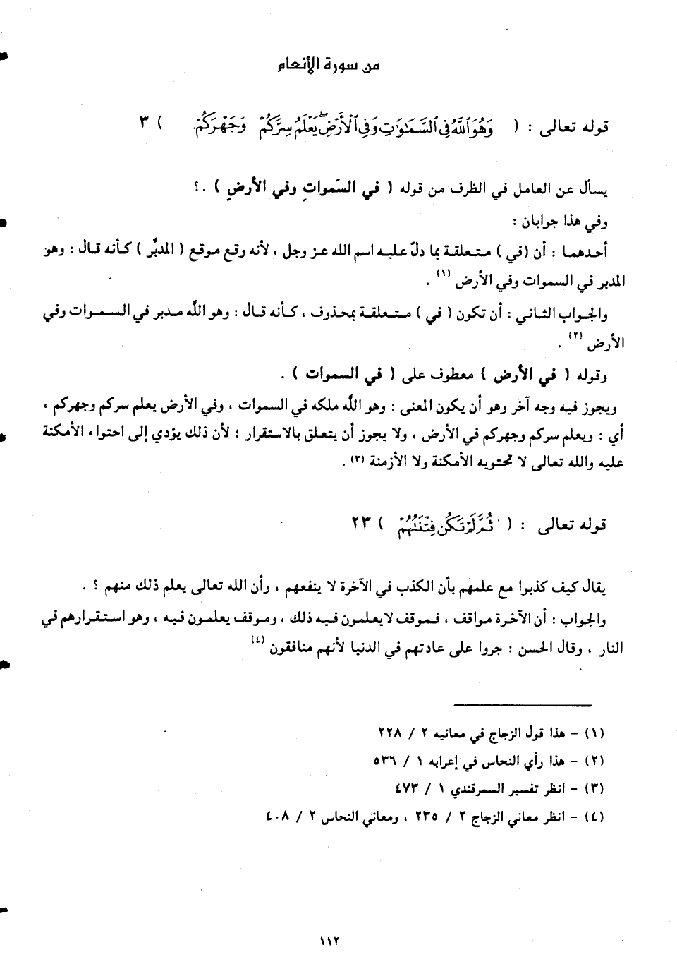 ويجوز فيه وجه آخر وهو أن يكون المعنى: وهو الله ملكه في السماوات وفي الأرض يعلم سركم وجهركم، أي: ويعلم سركم وجهركم في الأرض، ولا يجوز أن يتعلق بالاستقرار؛ لأنّ ذلك يؤدي إلى احتواء الأمكنة عليه والله تعالى لا تحتويه الأمكنة ولا الأزمنة.