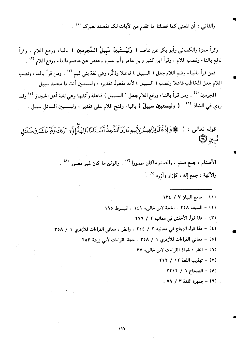 فمن قرأ بالياء وضم اللام جعل (السبيل) فاعلا وذكَّره وهي لغة بني تميم. ومن قرأ بالتاء ونصب اللام جعل المخاطب فاعلا ونصب (السبيل) لأنّه مفعول تقديره: ولتستبين أنت يا محمد سبيل المجرمين. ومن قرأ بالتاء ورفع اللام جعل (السبيل) فاعلة وأنثها وهي لغة أهل الحجاز وقد روي في الشاذ. (وَلِيَسْتَبِينَ سَبِيلَ) بالياء وفتح اللام على تقدير: وليستبين السائل سبيل.