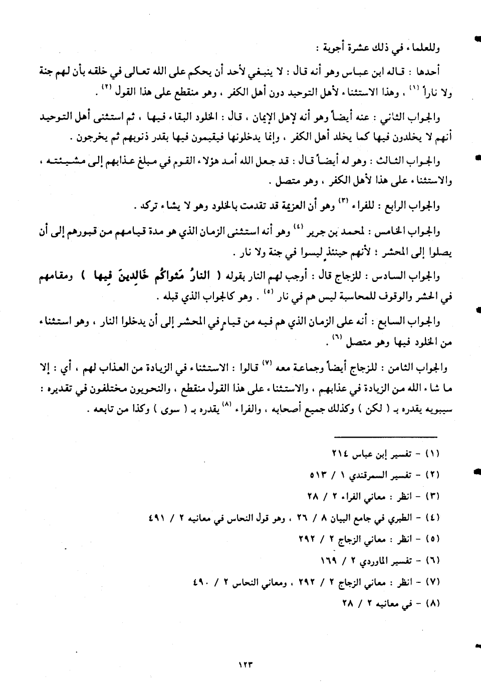 والجواب الثامن: للزجاج أيضاً وجماعة معه قالوا: الاستثناء في الزيادة من العذاب لهم، أي: إلا ما شاء الله من الزيادة في عذابهم، والاستثناء على هذا القول منقطع، والنحويون مختلفون في تقديره: سيبويه يقدره بـ (لكن) وكذلك جميع أصحابه، والفراء يقدره بـ (سوى) وكذا من تابعه.