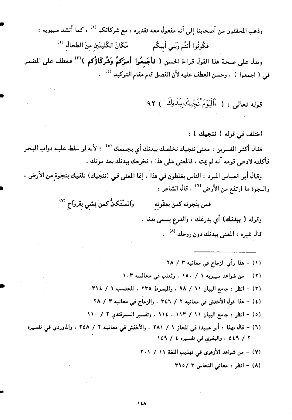 وقال أبو العباس المبرد: الناس يغلطون في هذا. إنما المعنى في (ننجيك) نلقيك بنجوةٍ من الأرض، والنجوة ما ارتفع من الأرض، قال الشاعر: