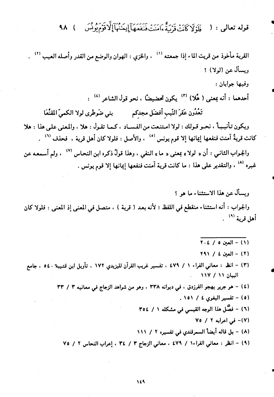 والجواب: أنّه استثناء منقطع في اللفظ؛ لأنَّه بعد (قرية)، متصل في المعنى إذ المعنى: فلولا كان أهل قرية.