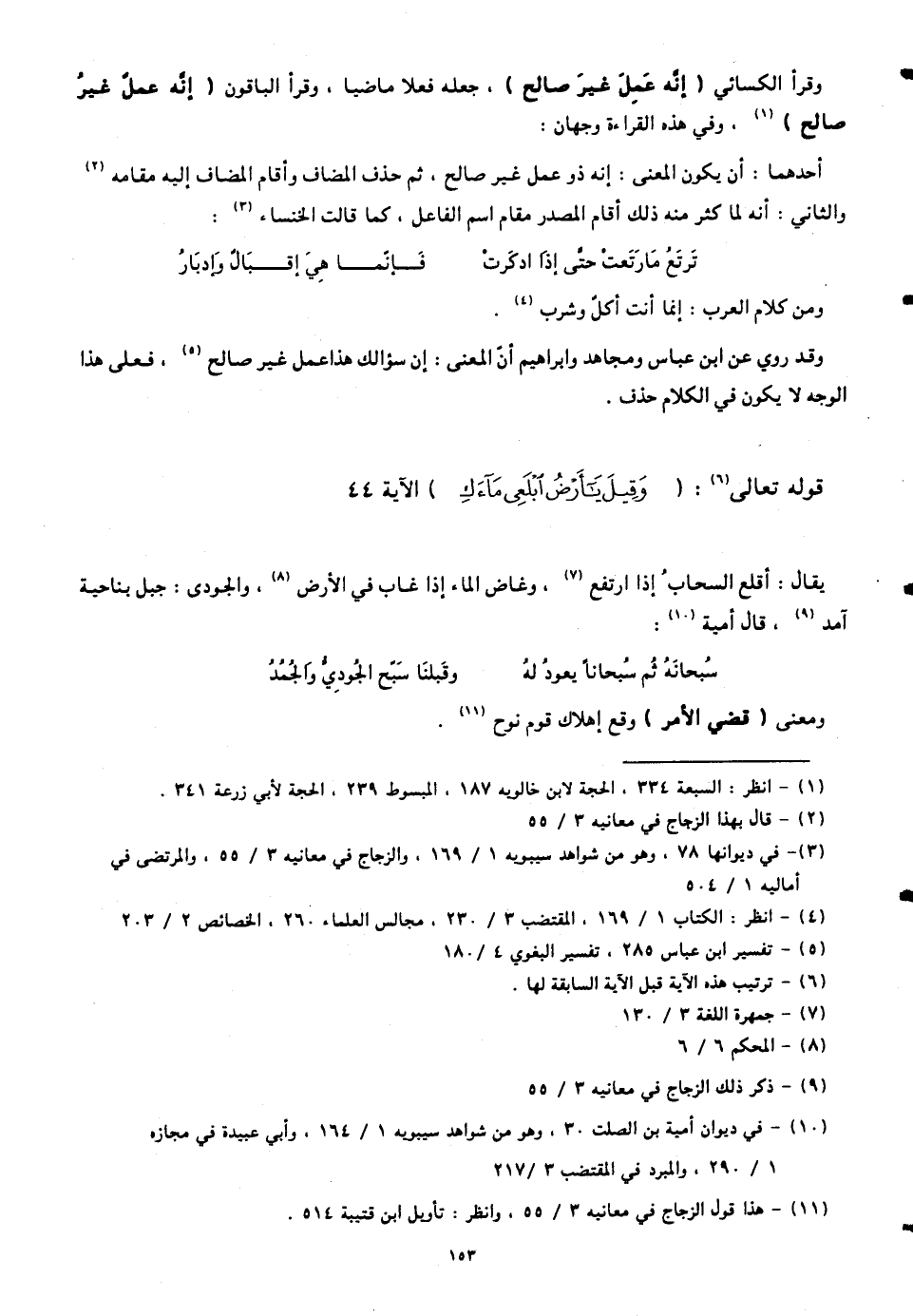 وقرأ الكسائي (إِنَّهُ عَمِلَ غَيْرَ صَالِحٍ)، جعله فعلا ماضيا، وقرأ الباقون (إِنَّهُ عَمَلٌ غَيْرُ صَالِحٍ)، وفي هذه القراءة وجهان: