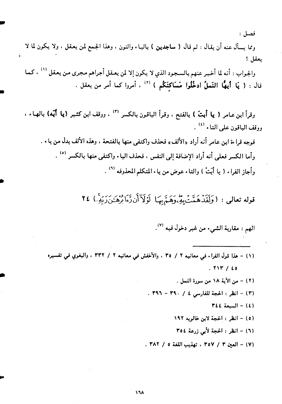 فوجه قراءة ابن عامر أنّه أراد " الألف " فحذف واكتفى منها بالفتحة، وهذه الألف بدل من ياء.