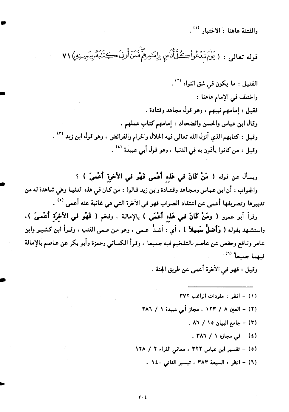 وقرأ أبو عمرو (وَمَنْ كَانَ فِي هَذِهِ أَعْمَى) بالإمالة، وفخم (فَهُوَ فِي الْآخِرَةِ أَعْمَى)، واستشهد بقوله (وَأَضَلُّ سَبِيلًا)، أي: أشد عمى، وهو من عمى القلب، وقرأ ابن كثير وابن عامر ونافع وحفص عن عاصم بالتفخيم فيه جميعاً، وقرأ الكسائي وحمزة وأبو بكر عن عاصم بالإمالة فيهما جميعاً.