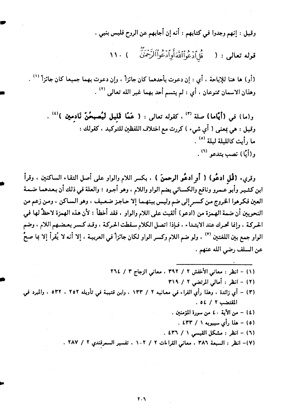 وقرئ (قُلِ ادْعُوا)، (أَوِ ادْعُوا الرَّحْمَنَ)، بكسر اللام والواو على أصل التقاء الساكنين، وقرأ ابن كثير وأبو عمرو ونافع والكسائي بضم الواو واللام، وهو أجود، والعلة في ذلك أنّ بعدهما ضمة العين فكرهوا الخروج من كسر إلى ضم وليس بينهما إلا حاجز ضعيف، وهو الساكن، ومن زعم من النحويين أنّ ضمة الهمزة من (ادعو) ألقيت على اللام والواو، فقد أخطأ؛ لأنّ هذه الهمزة لا حظَّ لها في الحركة، وإنما تحرك عند الابتداء، فإذا اتصل الكلام سقطت الحركة، وقد كسر بعضهم اللام، وضم الواو جمع بين اللغتين، ولو ضم اللام وكسر الواو لكان جائزاً في العربية، إلا أنّه لا يُقرأ إلا بما صحَّ عن السلف رضي الله عنهم.