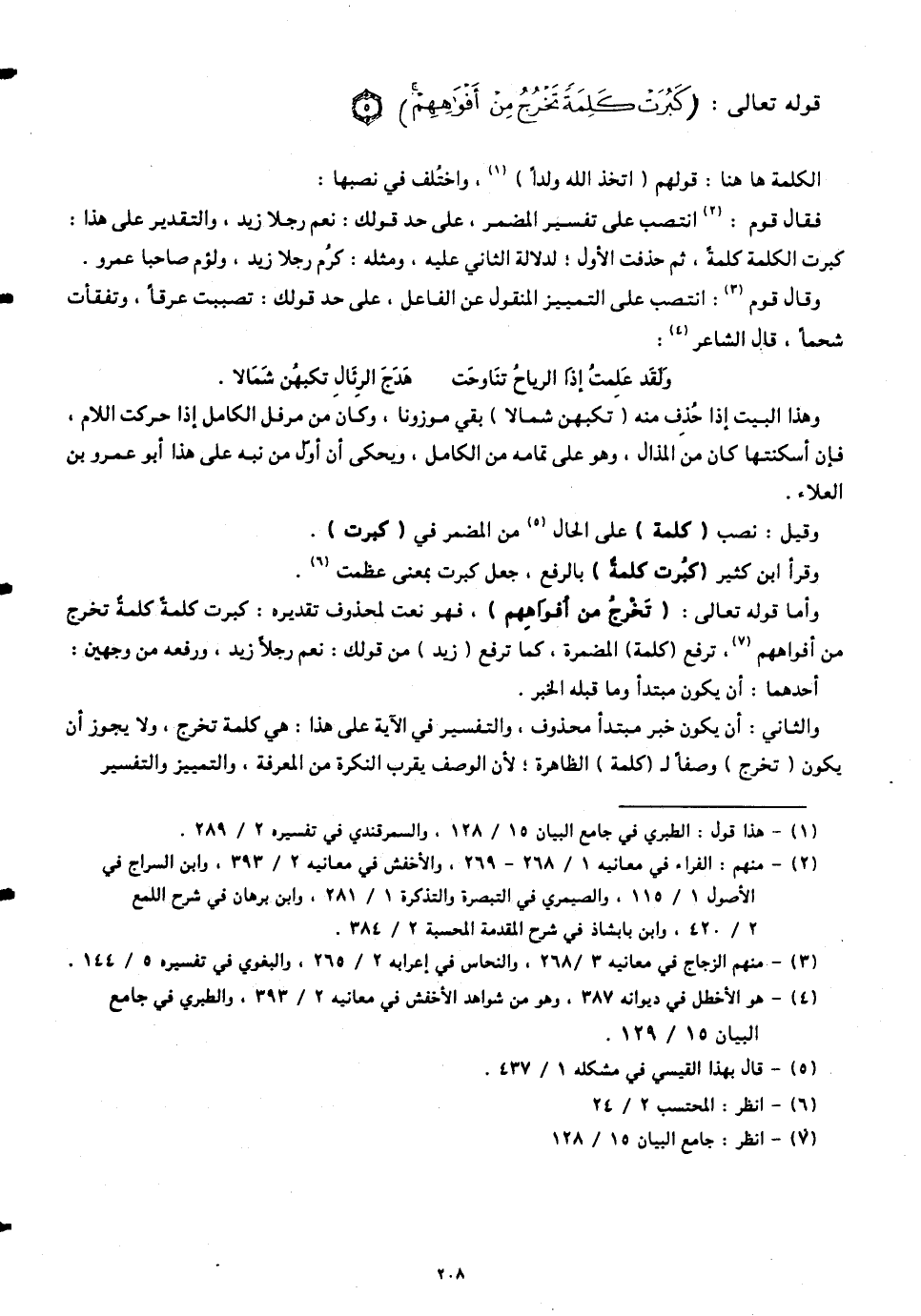 فقال قوم: انتصب على تفسير المضمر، على حد قولك: نعم رجلا زيد، والتقدير على هذا: كبرت الكلمة كلمةً، ثم حذفت الأول، لدلالة الثاني عليه. ومثله: كرُم رجلا زيد، ولؤم صاحبا عمرو. وقال قوم: انتصب على التمييز المنقول عن الفاعل. على حد قولك: تصببت عرقاً، وتفقأت شحماً، قال الشاعر: