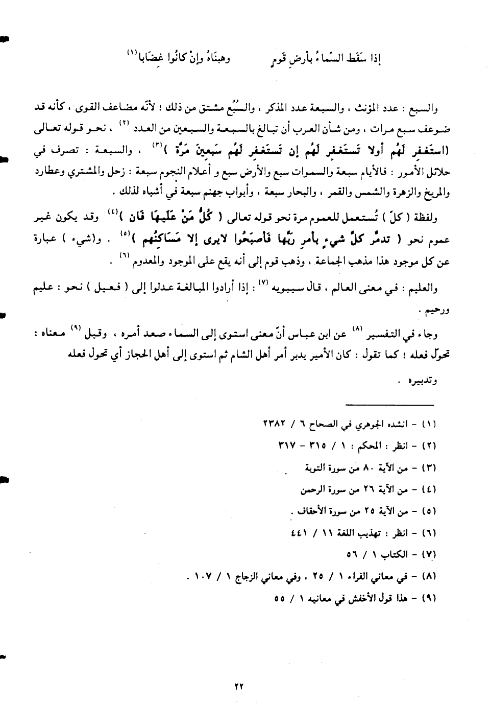 والسبع: عدد المؤنث، السبعة عدد المذكر، والسُبُع مشتق من ذلك؛ لأنّه مضاعف القوى، كأنّه قد ضوعف سبع مرات، ومن شأن العرب أنّ تبالغ بالسبعة والسبعين من العدد، نحو قوله تعالى (اسْتَغْفِرْ لَهُمْ أَوْ لَا تَسْتَغْفِرْ لَهُمْ إِنْ تَسْتَغْفِرْ لَهُمْ سَبْعِينَ مَرَّةً)، والسبعة: تصرف في جلائل الأمور: فالأيام سبعة والسماوات سبع والأرض سبع وأعلام النجوم سبعة: زحل والمشتري وعطارد والمريخ والزهرة والشمس والقمر، والبحار سبعة، وأبواب جهنم سبعة في أشباه لذلك.