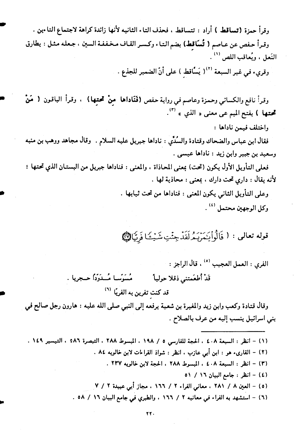 وقرأ نافع والكسائي وحمزة وعاصم في رواية حفص (فَنَادَاهَا مِنْ تَحْتِهَا). وقرأ الباقون (مَنْ تَحْتَهَا) بفتح الميم على معنى " الذي ".