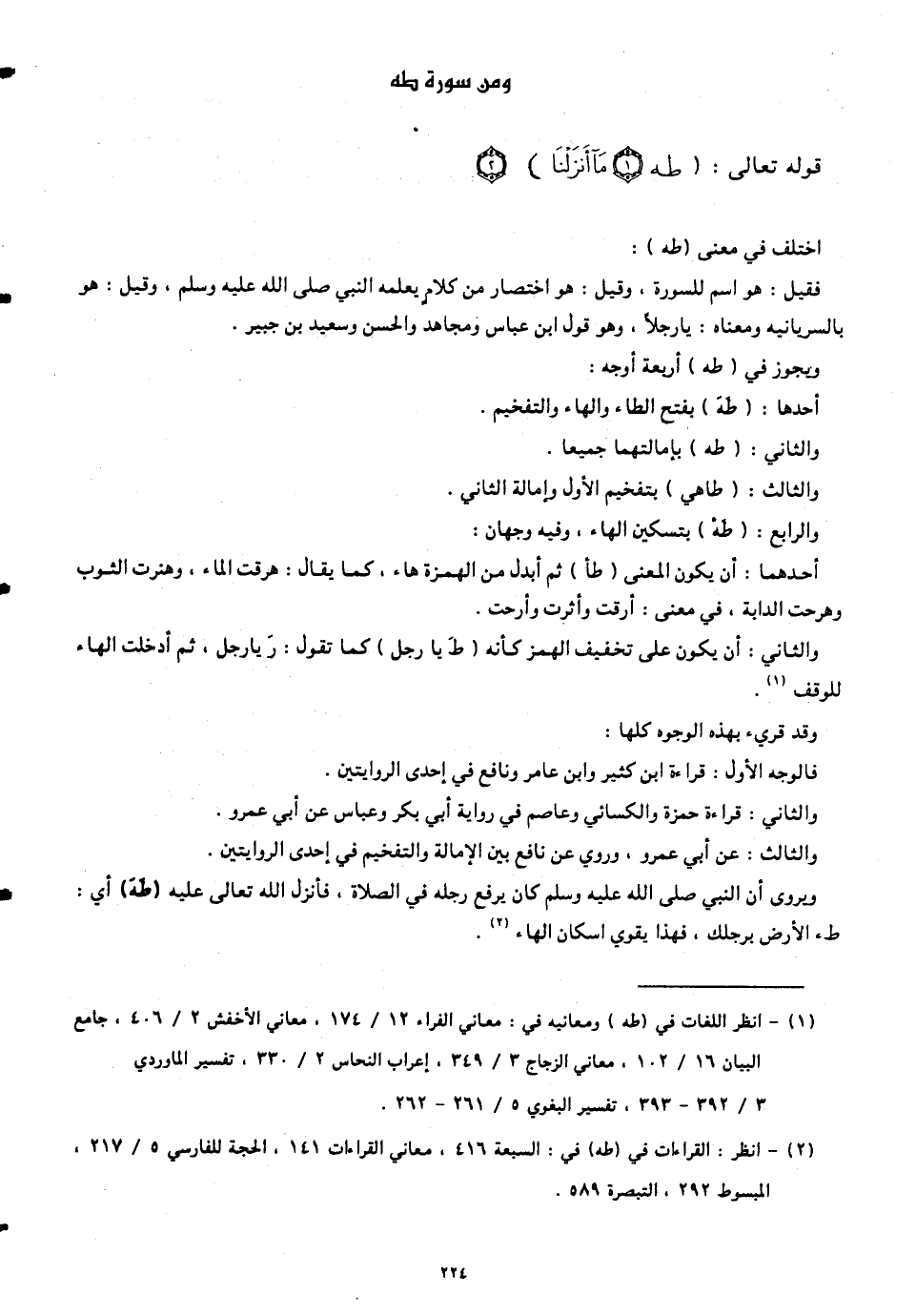 ويروى أنّ النبي صلى الله عليه وسلم كان يرفع رجله في الصلاة، فأنزل الله تعالى عليه (طَهَ) أي: طء الأرض برجلك، فهذا يقوي إسكان الهاء.