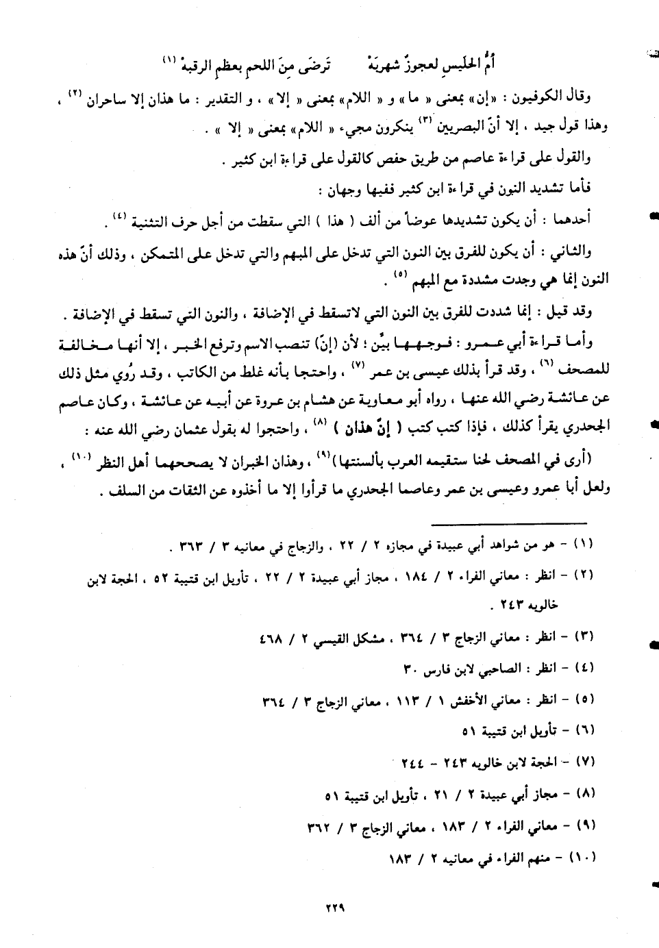 وأما قراءة أبي عمرو: فوجهها بيِّن؛ لأنّ (إنَّ) تنصب الاسم وترفع الخبر، إلا أنها مخالفة للمصحف، وقد قرأ بذلك عيسى بن عمر، واحتجا بأنه غلط من الكاتب، وقد رُوي مثل ذلك عن عائشة رضي الله عنها، رواه أبو معاوية عن هشام بن عروة عن أبيه عن عائشة، وكان عاصم الجحدري يقرأ كذلك، فإذا كتب كتب (إن هذان)، واحتجوا له بقول عثمان رضي الله عنه: