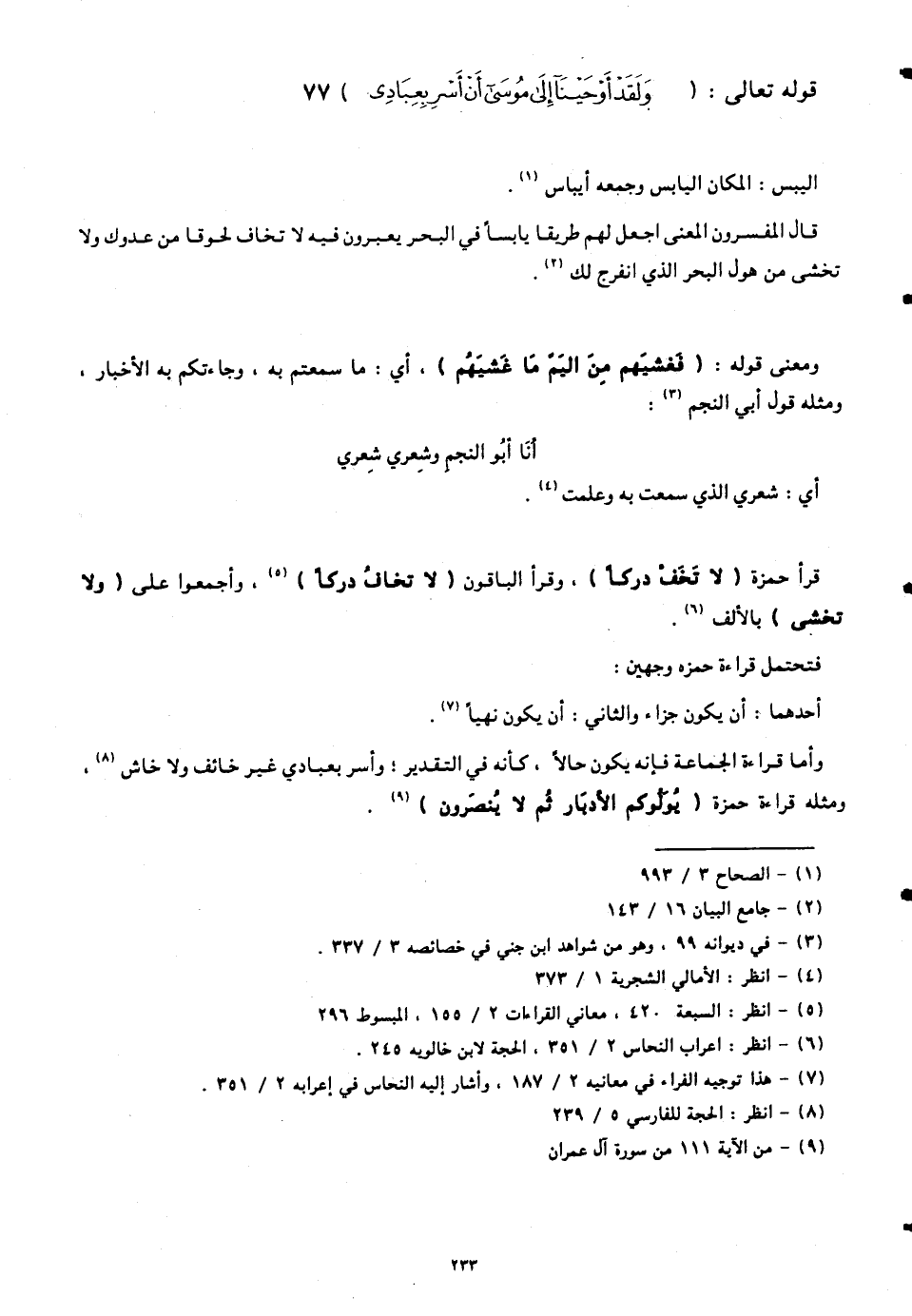 وأما قراءة الجماعة فإنه يكون حالًا، كأنّه في التقدير، وأسر بعبادي غير خائفٍ ولا خاشٍ، ومثله قراءة حمزة (يُوَلُّوكُمُ الْأَدْبَارَ ثُمَّ لَا يُنْصَرُونَ).