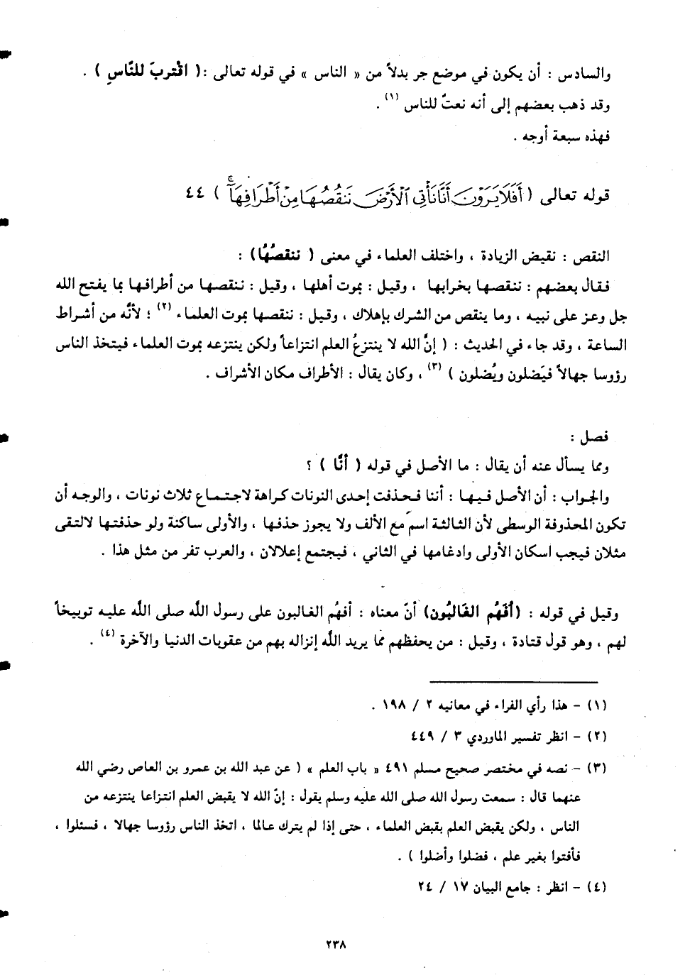 فقال بعضهم: ننقصها بخرابها، وقيل: بموت أهلها، وقيل: ننقصها من أطرافها بما يفتح الله جل وعز على نبيه، وما ينقص من الشرك بإهلاك وقيل: ننقصها بموت العلماء؛ لأنَّه من أشراط الساعة، وقد جاء في الحديث: (إن الله لا ينتزعُ العلم انتزاعاً ولكن ينتزعه بموت العلماء فيتخذ الناس رؤوسا جهالًا فيَضلون ويُضلون)، وكان يقال: الأطراف مكان الأشراف.