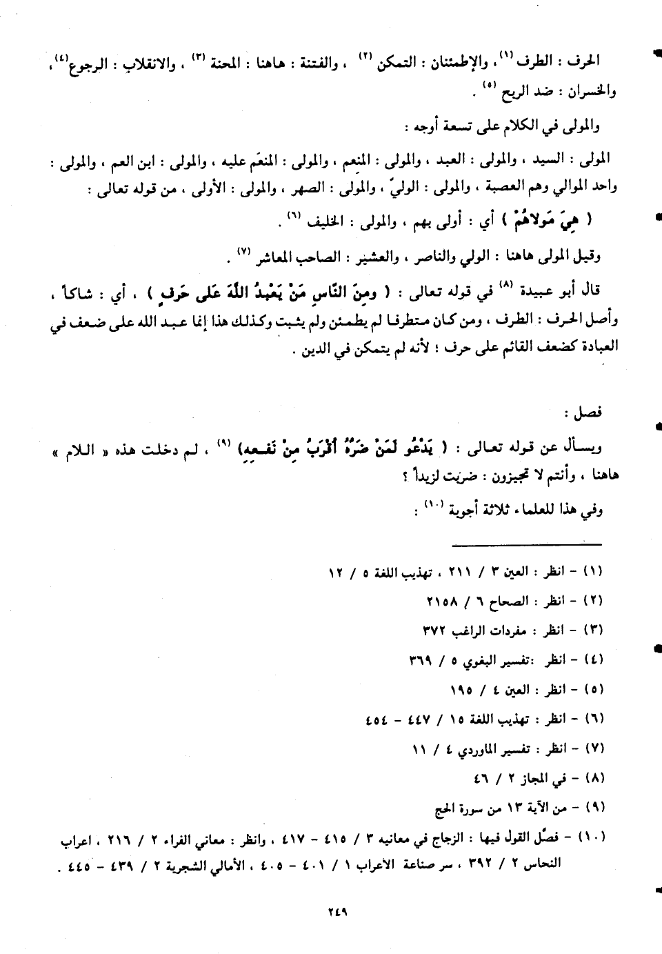 قال أبو عبيدة في قوله تعالى: (وَمِنَ النَّاسِ مَنْ يَعْبُدُ اللَّهَ عَلَى حَرْفٍ)، أي: شاكاً، وأصل الحرف: الطرف، ومن كان متطرفا لم يطمئن ولم يثبت وكذلك هذا إنما عبد الله على ضعف في العبادة كضعف القائم على حرف، لأنّه لم يتمكن في الدين.