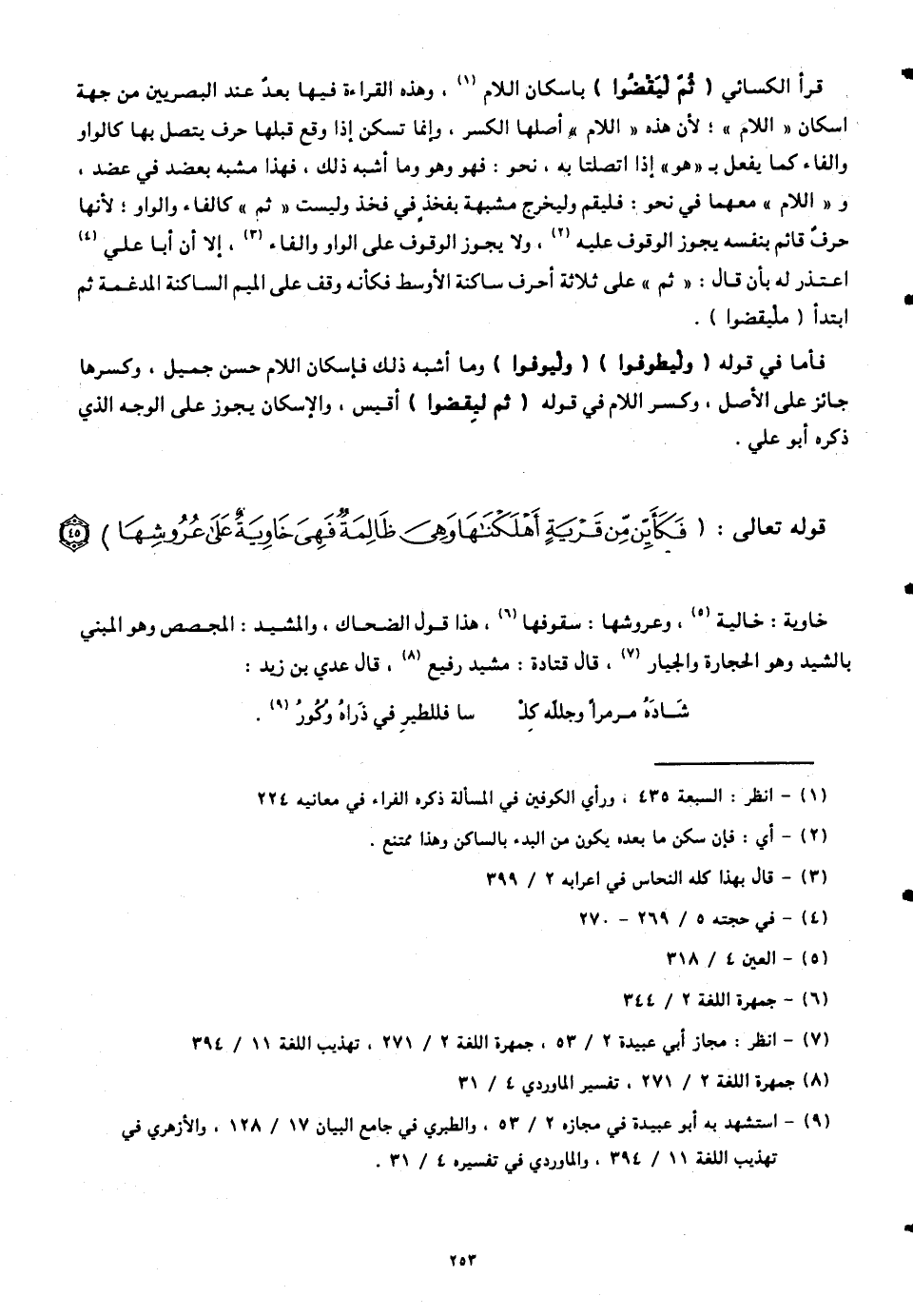 قرأ الكسائي (ثُمَّ لْيَقْضُوا) بإسكان اللام، وهذه القراءة فيها بعدٌ عند البصريين من جهة إسكان " اللام ". لأنّ هذه " اللام " أصلها الكسر، وإنما تسكن إذا وقع قبلها حرف يتصل بها كالواو والفاء كما يفعل بـ، " هو " إذا اتصلتا به. نحو: فهو وهو وما أشبه ذلك، فهذا مشبه بعضد في عضد، و (اللام) معهما في نحو: فليقم وليخرج مشبهة بفخذٍ في فخذ وليست " ثم " كالفاء والواو؛ لأنَّها حرف قائم بنفسه يجوز الوقوف عليه. ولا يجوز الوقوف على الواو والفاء، إلا أنّ أبا علي اعتذر له بأن قال: " ثم " على ثلاثة أحرف ساكنة الأوسط فكأنه وقف على الميم الساكنة المدغمة ثم ابتدأ (ملْيقضوا).