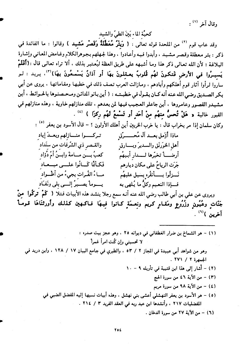 وقد عاب قوم من الملحدة قوله تعالى، (وَبِئْرٍ مُعَطَّلَةٍ وَقَصْرٍ مَشِيدٍ) وقالوا: ما الفائدة في ذكر: بئر معطلة وقصر مشيد، وأبدوا فيه وأعادوا، وهذا لجهلهم بجوهر الكلام وغامض المعاني وإشارة البلاغة، لأنّ الله تعالى ذكر هذا وما أشبهه على طريق العظة ليُعتبر بذلك، ألا تراه تعالى قال: (أَفَلَمْ يَسِيرُوا فِي الْأَرْضِ فَتَكُونَ لَهُمْ قُلُوبٌ يَعْقِلُونَ بِهَا أَوْ آذَانٌ يَسْمَعُونَ بِهَا)، يريد: لو صاروا لرأوا آثار قوم أهلكهم وأبادهم، وما زالت العرب تصف ذلك في خطبها ومقاماتها، يروى عن أبي بكر الصديق رضي الله عنه أنّه كان يقول في خطبته: (أين بانو المدائن ومحصنوها بالحوائط، أين مشيدو القصور وعامروها، أين جاعلو العجيب فيها لمن بعدهم. تلك منازلهم خاوية، وهذه منازلهم في القبور خالية (هَلْ تُحِسُّ مِنْهُمْ مِنْ أَحَدٍ أَوْ تَسْمَعُ لَهُمْ رِكْزًا (98)).