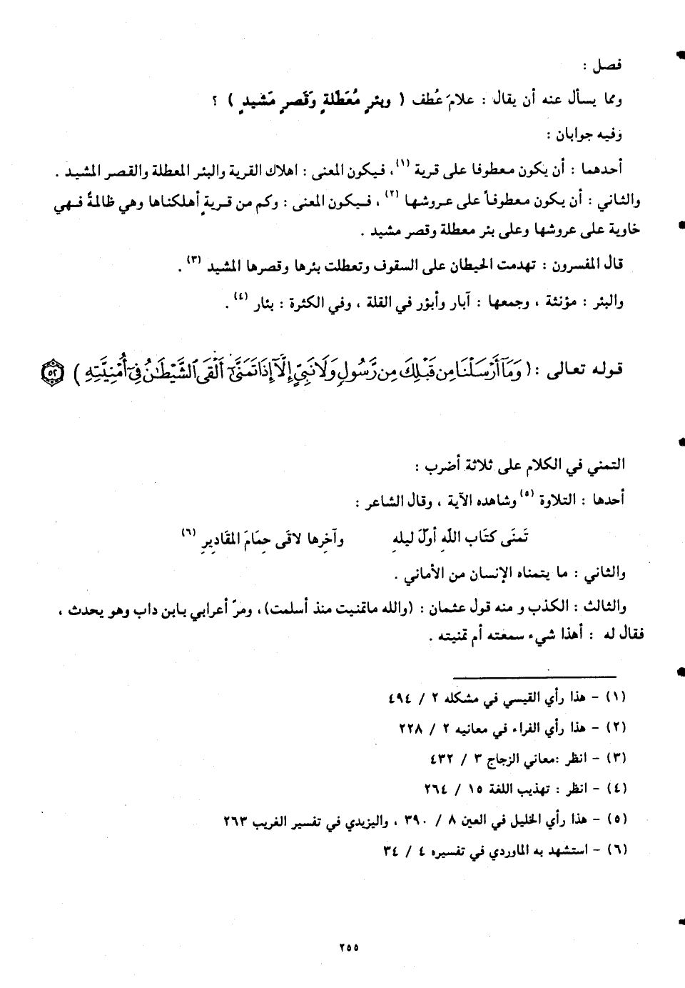 والثاني: أن يكون معطوفاً على عروشها. فيكون المعنى: وكم من قريةٍ أهلكناها وهي ظالمةٌ فهي خاوية على عروشها وعلى بئر معطلة وقصر مشيد.