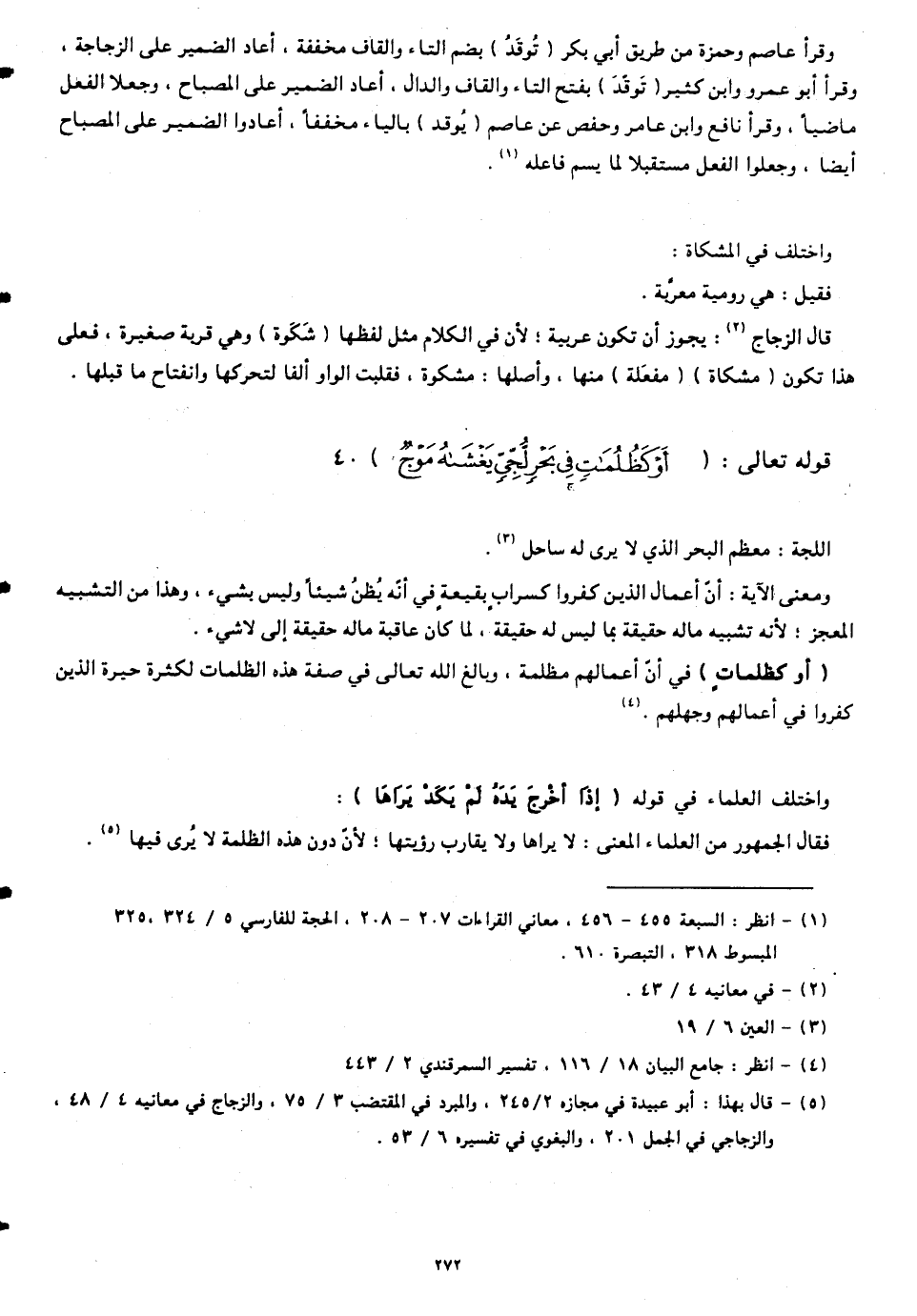 وقرأ عاصم وحمزة من طريق أبي بكر (تُوقَدُ) بضم التاء والقاف مخففة. أعاد الضمير على الزجاجة، وقرأ أبو عمرو وابن كثير (تَوَقَّدَ) بفتح التاء والقاف والدال، أعاد الضمير على المصباح، وجعلا الفعل ماضياً، وقرأ نافع وابن عامر وحفص عن عاصم (يُوقَدُ) بالياء مخففاً، أعادوا الضمير على المصباح أيضا، وجعلوا الفعل مستقبلا لما يسم فاعله.