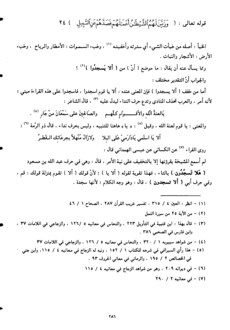 لم أسمع المشيخة يقرؤنها إلا بالتخفيف على نية الأمر، قال: وهي في حرف عبد الله بن مسعود (هَلا تَسجُدُون) بالتاء، فهذا تقولة لقوله (ألا يا)؛ لأنّ قولك (ألا) تقوم بمنزلة قولك: قم، وفي حرف أُبي (ألا تسجدون)، قال: وهو وجه الكلام، لأنها سجدة.
