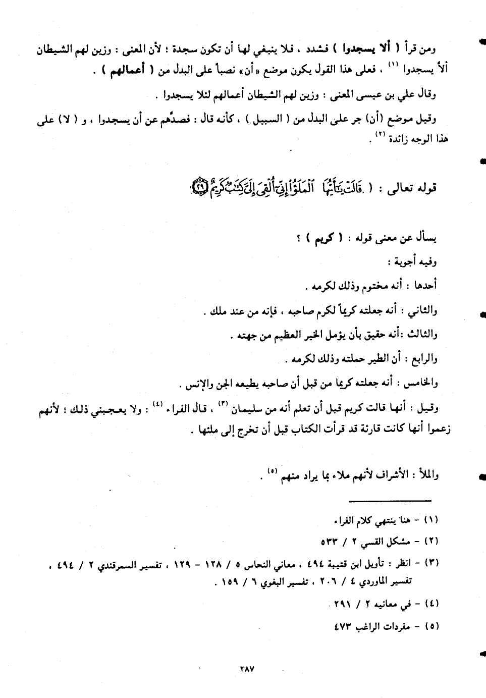 وقيل: أنها قالت كريم قبل أن تعلم أنّه من سليمان، قال الفراء: ولا يعجبني ذلك، لأنهم زعموا أنها كانت قارئة قد قرأت الكتاب قبل أن تخرج إلى ملئها.