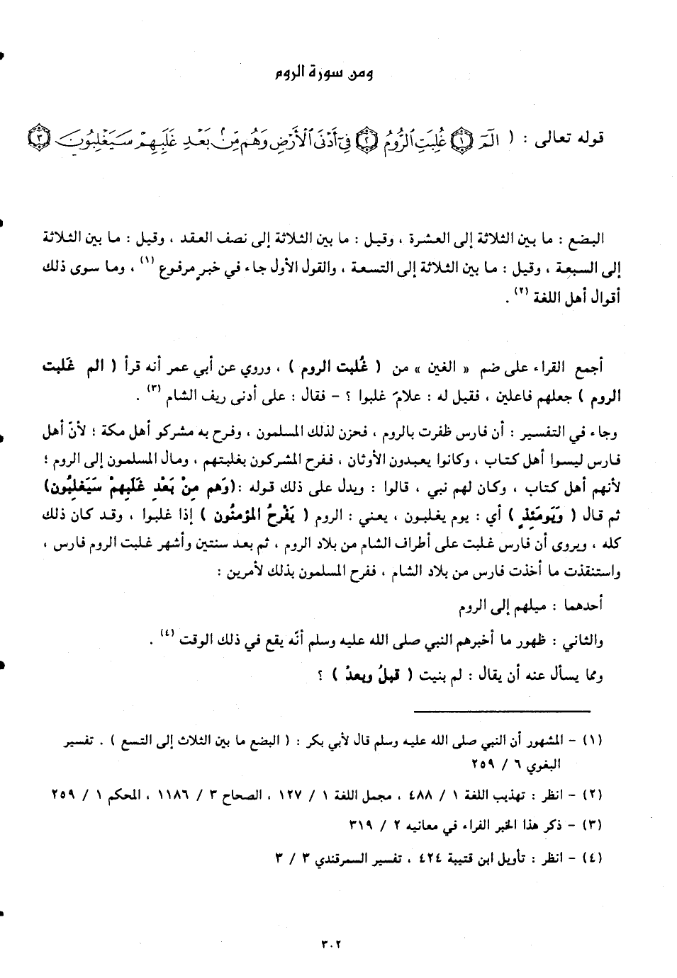 وجاء في التفسير: أنّ فارس ظفرت بالروم، فحزن لذلك المسلمون، وفرح به مشركو أهل مكة؛ لأنّ أهل فارس ليسوا أهل كتاب، وكانوا يعبدون الأوثان، ففرح المشركون بغلبتهم. ومال المسلمون إلى الروم؛ لأنهم أهل كتاب، وكان لهم نبي، قالوا: ويدل على ذلك قوله: (وَهُمْ مِنْ بَعْدِ غَلَبِهِمْ سَيَغْلِبُونَ) ثم قال (وَيَوْمَئِذٍ) أي: يوم يغلبون، يعني: الروم (يَفْرَحُ الْمُؤْمِنُونَ) إذا غلبوا، وقد كان ذلك كله، ويروى أنّ فارس غلبت على أطراف الشام من بلاد الروم، ثم بعد سنتين وأشهُر غلبت الروم فارس، واستنقذت ما أخذت فارس من بلاد الشام، ففرح المسلمون بذلك لأمرين: