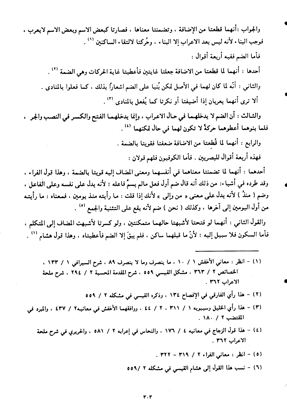 أحدهما: أنهما لما تضمنتا معناهما في أنفسهما ومعنى المضاف إليه قويتا بالضمة، وهذا قول الفراء، وقد طرده في أشياء: من ذلك أنّه قال ضم أول فعل ما لم يسم فاعله، لأنّه يدل على نفسه وعلى الفاعل، وضم (منذُ) لأنّه يدل على معنى " من وإلى " لأنك إذا قلت: ما رأيته منذ يومين. فمعناه: ما رأيته من أول اليومين إلى آخرها. وكذلك (نحن) ضم لأنّه يقع على التثنية والجمع.