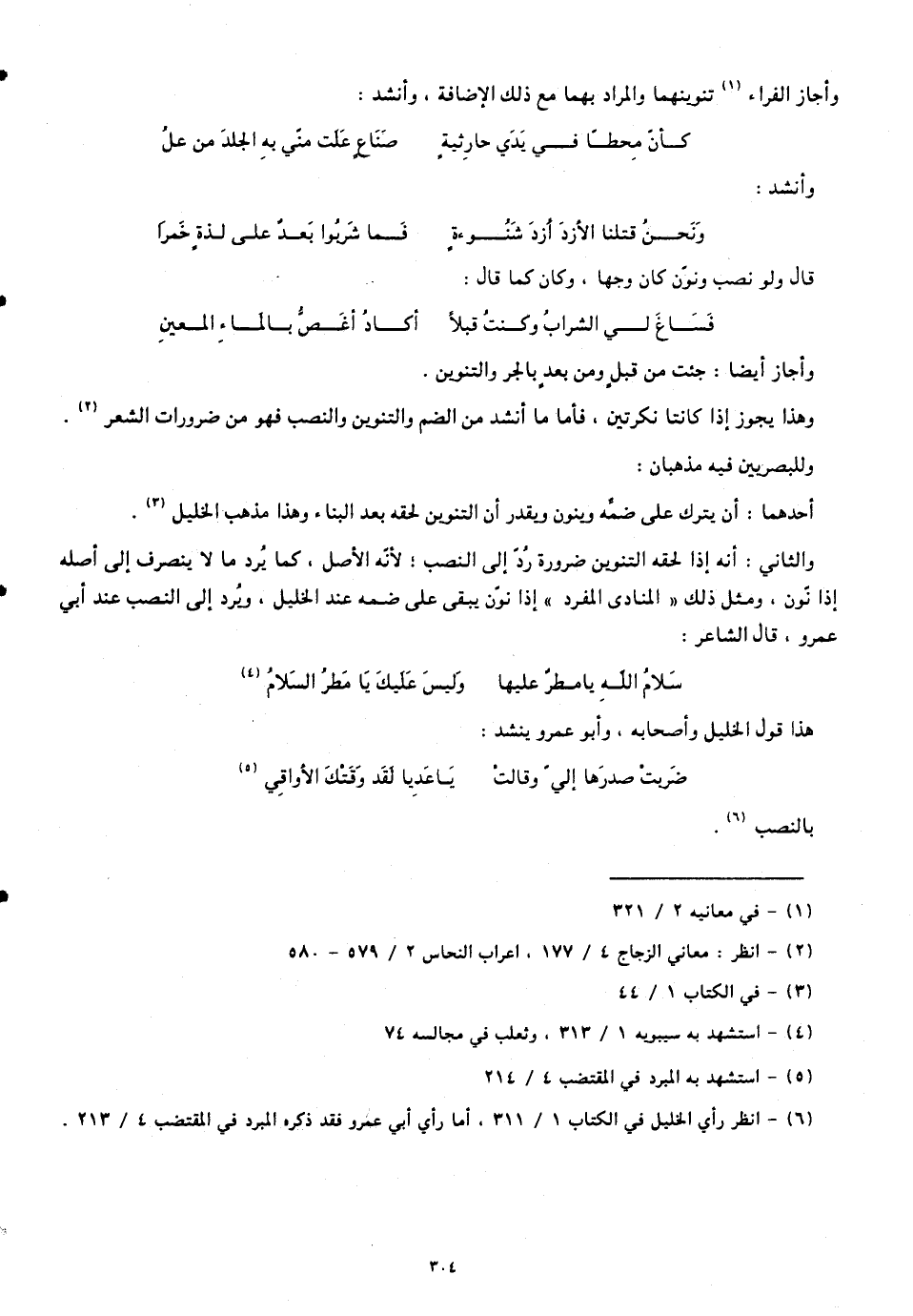والثاني: أنّه إذا لحقه التنوين ضرورة رُد إلى النصب؛ لأنَّه الأصل، كما يُرد ما لا ينصرف إلى أصله إذا نون، ومثل ذلك " المنادى المفرد " إذا نوّن يبقى على ضمه عند الخليل، ويُرد إلى النصب عند أبي عمرو، قال الشاعر: