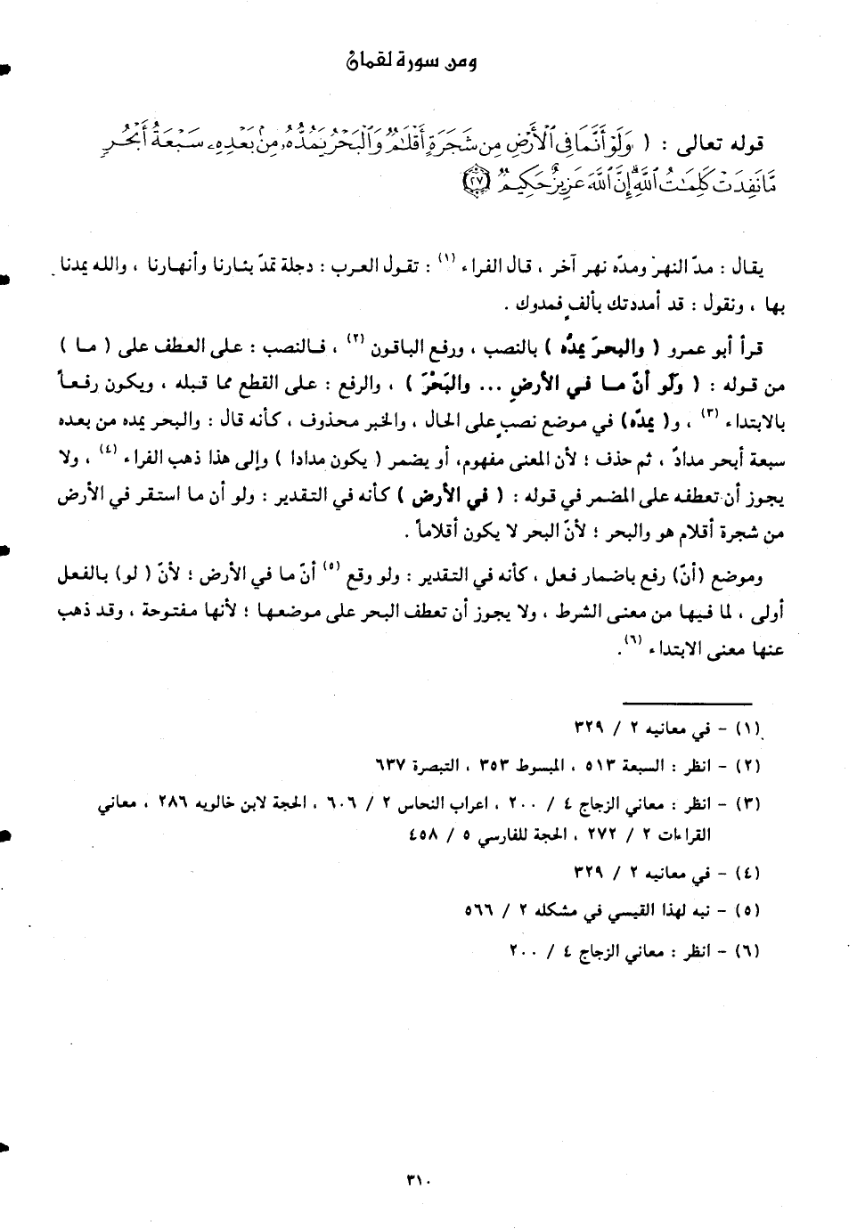 قرأ أبو عمرو (وَالْبَحْرَ يَمُدُّهُ) بالنصب، ورفع الباقون، فالنصب: على العطف على (ما) من قوله: (وَلَوْ أَنَّمَا فِي الْأَرْضِ ... وَالْبَحْرَ)، والرفع: على القطع مما قبله، ويكون رفعاً بالابتداء، و (يَمُدُّهُ) في موضع نصبٍ على الحال، والخبر محذوف، كأنّه قال: والبحر يمده من بعده سبعة أبحر مدادٌ، ثم حذف، لأنّ المعنى مفهوم، أو يضمر (يكون مدادا) وإلى هذا ذهب الفراء، ولا يجوز أن تعطفه على المضمر في قوله: (في الأرض) كأنّه في التقدير: ولو أنّ ما استقر في الأرض من شجرة أقلام هو والبحر، لأنّ البحر لا يكون أقلاماً.