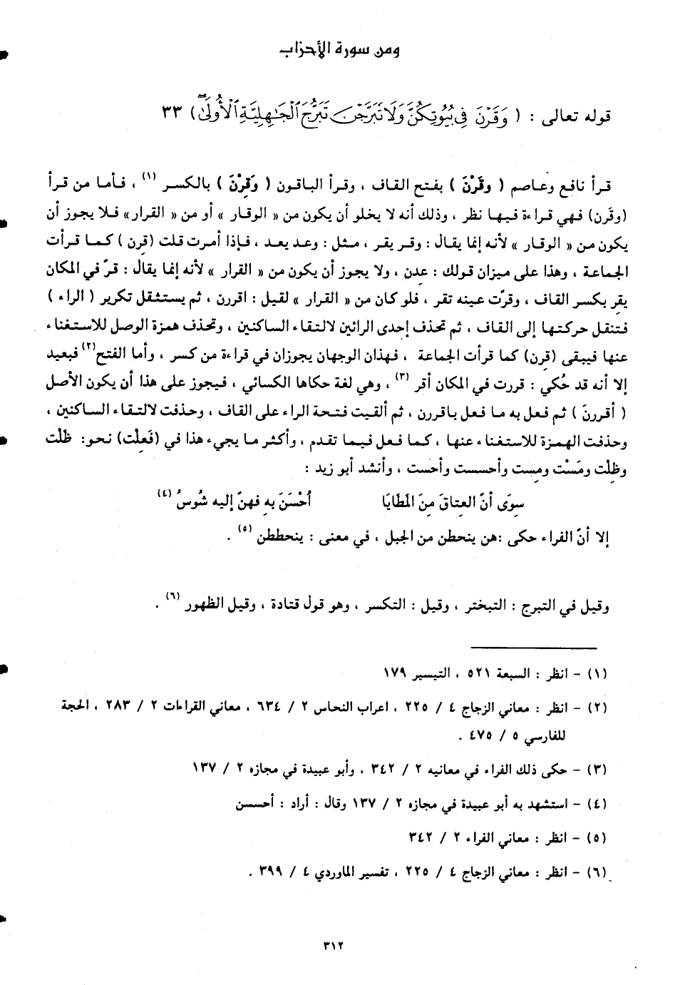 قرأ نافع وعاصم (وَقَرْنَ) بفتح القاف، وقرأ الباقون (وَقِرْنَ) بالكسر، فأما من قرأ (وَقَرْنَ) فهي قراءة فيها نظر، وذلك أنّه لا يخلو أن يكون من " الوقار " أو من " القرار " فلا يجوز أنّ يكون من " الوقار " لأنّه إنما يقال: وقر يقر، مثل: وعد يعد. فإذا أمرت قلت (قِرن) كما قرأت الجماعة، وهذا على ميزان قولك: عِدن، ولا يجوز أن يكون من " القرار " لأنّه إنما يقال: قرّ في المكان يقِر بكسر القاف، وقرَّت عينه تقر، فلو كان من " القرار " لقيل: اقررن، ثم يستثقل تكرير (الراء) فتنقل حركتها إلى القاف، ثم تحذف إحدى الرائين لالتقاء الساكنين، وتحذف همزة الوصل للاستغناء عنها فيبقى (قِرن) كما قرأت الجماعة. فهذان الوجهان يجوزان في قراءة من كسر، وأما الفتح فبعيد إلا أنّه قد حُكي: قررت في المكان أقر، وهي لغة حكاها الكسائي. فيجوز على هذا أن يكون الأصل (اقررنَ) ثم فعل به ما فعل بـ اقررن، ثم ألقيت فتحة الراء على القاف، وحذفت لالتقاء الساكنين، وحذفت الهمزة للاستغناء عنها. كما فعل فيما تقدم، وأكثر ما يجيء هذا في (فَعِلت) نحو: ظَلْت وظِلْت ومَسْت ومِسْت وأحسست وأحست، وأنشد أبو زيد: