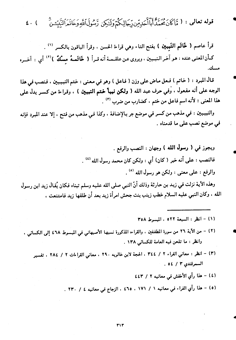 قوله تعالى: (مَا كَانَ مُحَمَّدٌ أَبَا أَحَدٍ مِنْ رِجَالِكُمْ وَلَكِنْ رَسُولَ اللَّهِ وَخَاتَمَ النَّبِيِّينَ ... (40))