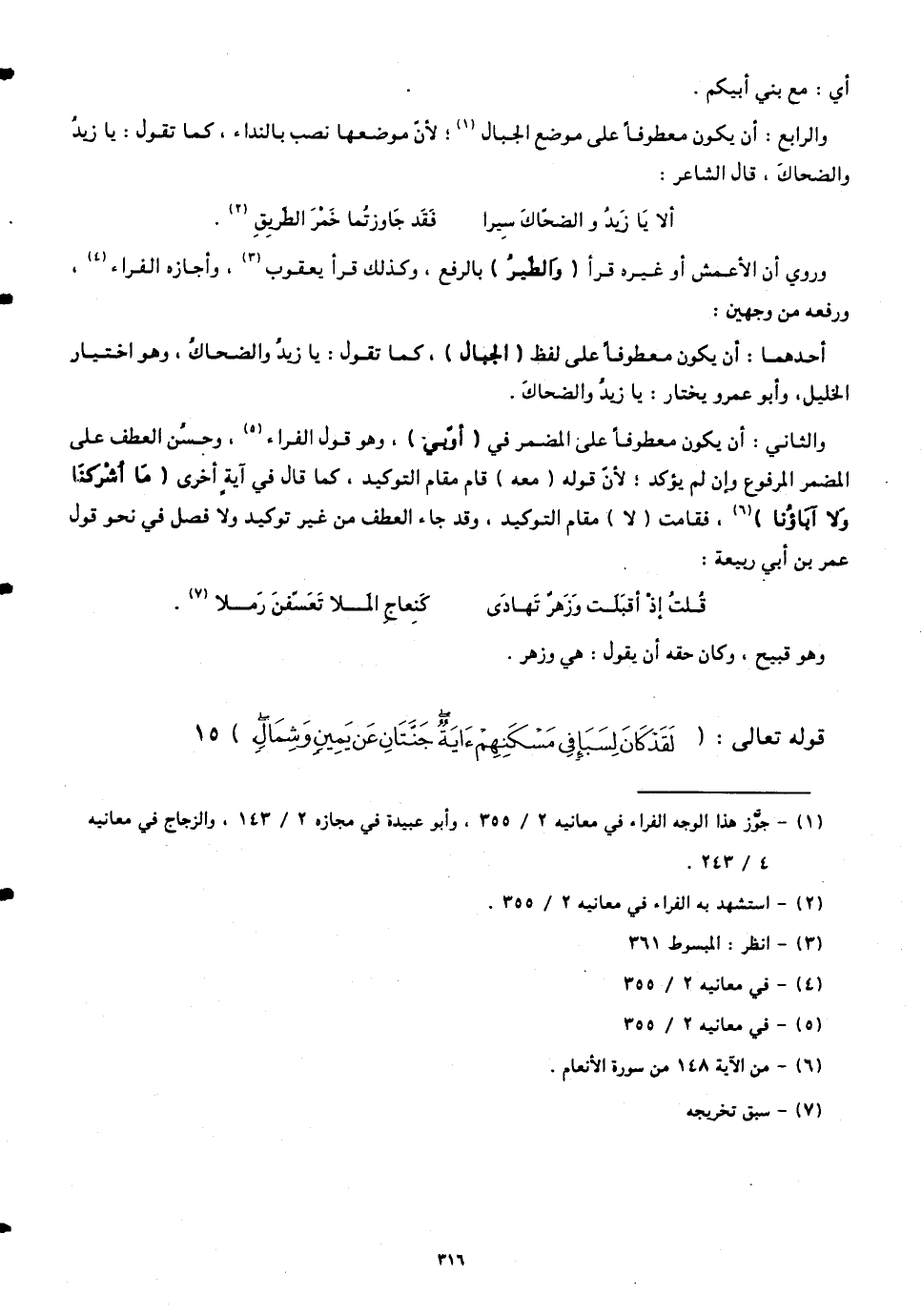 والثاني: أن يكون معطوفاً على المضمر في (أَوِّبِي) وهو قول الفراء. وحسُن العطف على المضمر المرفوع وإن لم يؤكد؛ لأنَّ قوله (معه) قام مقام التوكيد، كما قال في آيةٍ أخرى (مَا أَشْرَكْنَا وَلَا آبَاؤُنَا)، فقامت (لا) مقام التوكيد. وقد جاء العطف من غير توكيد ولا فصل في نحو قول عمر بن أبي ربيعة: