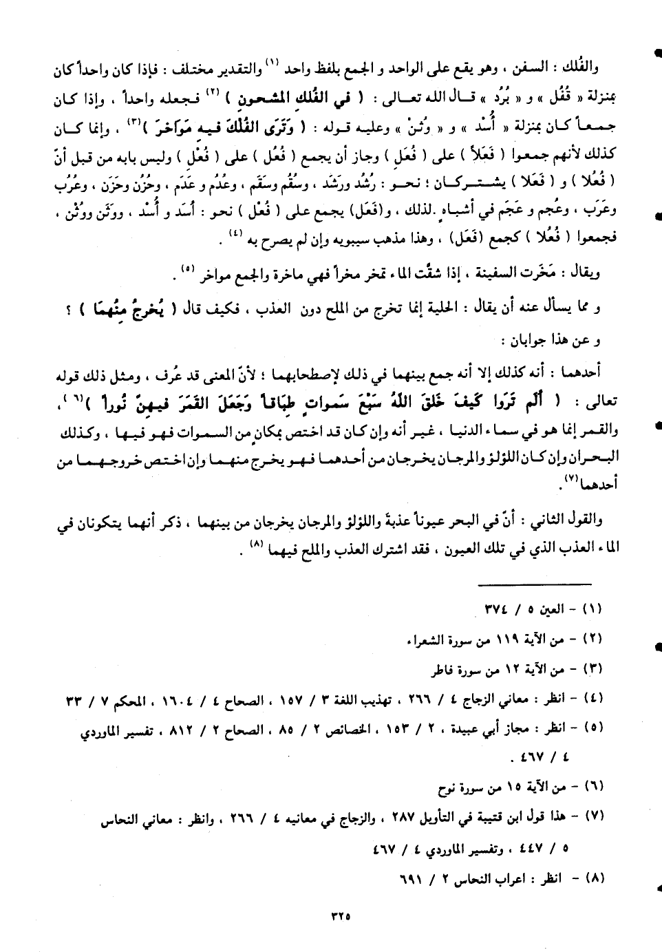 والفُلك: السفن، وهو يقع على الواحد والجمع بلفظ واحد والتقدير مختلف: فإذا كان واحداً كان بمنزلة " قُفُل " و " بُرُد " قال الله تعالى: (فِي الْفُلْكِ الْمَشْحُونِ) فجعله واحداً. وإذا كان جمعاً كان بمنزلة " أُسْد " و " وُثن " وعليه قوله: (وَتَرَى الفُلكَ فيهِ مَواخرَ) وإنما كان كذلك لأنهم جمعوا (فَعَلا) على (فُعَلِ) وجاز أن يجمع (فُعُل) على (فُعْلِ) وليس بابه من قبل أنّ (فُعُلا) و (فَعَلا) يشتركان؛ نحو: رُشُد ورَشَد، وسُقُم وسَقَم، وعُدُم وعَدَم، وحُزُن وحَزَن، وعُرُب وعَرَب، وعُجم وعَجَم في أشباه. لذلك، و (فَعَل) يجمع على (فُعْل) نحو: أُسَد وأُسْد، ووَثَن ووُثْن، فجمعوا (فُعُلا) كجمع (فَعَل) وهذا مذهب سيبويه وإن لم يصرح به.