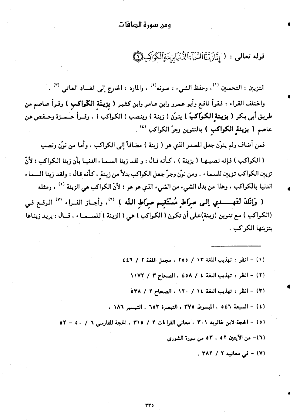 فمن أضاف ولم ينوّن جعل المصدر الذي هو (زِينَةٍ) مضافاً إلى الكواكب، وأما من نوّن ونصب (الكواكب) فإنه نصبها (بِزِينَةٍ)، كأنّه قال: ولقد زينا السماء الدنيا بأن زينا الكواكب، لأنّ تزيين الكواكب تزيين للسماء. ومن نوّن وجرّ جعل الكواكب بدلًا من (زِينَةٍ)، كأنّه قال: ولقد زينا السماء الدنيا بالكواكب، وهذا من بدل الشيء من الشيء الذي هو هو؛ لأنَّ الكواكب هي الزينة، ومثله (وَإِنَّكَ لَتَهْدِي إِلَى صِرَاطٍ مُسْتَقِيمٍ (52) صِرَاطِ اللَّهِ)، وأجاز الفراء الرفع في (الكواكب) مع تنوين (زينةٍ) على أن تكون (الكواكب) هي (الرينة) للسماء، قال: يريد زيناها بتزيينها الكواكب.