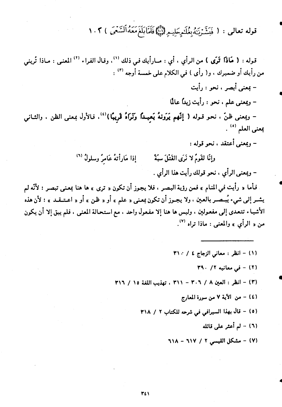 فأما " رأيت في المنام " فمن رؤية البصر، فلا يجوز أن تكون " ترى " هاهنا بمعنى تبصر؛ لأنَّه لم يشر إلى شيء يُبصر بالعين. ولا يجوز أن تكون بمعنى " علم " أو " ظن " أو " اعتقد "؛ لأنَّ هذه الأشياء تتعدى إلى مفعولين، وليس هاهنا إلا مفعول واحد، مع استحالة المعنى، فلم يبق إلا أن يكون من " الرأي " والمعنى: ماذا تراه.