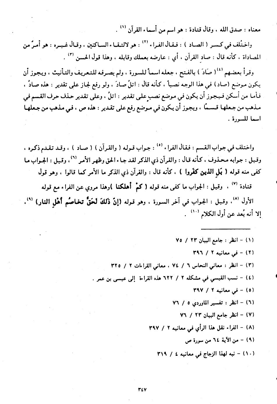 واختُلف في كسر (الصاد): فقال الفراء: هو لالتقاء الساكنين، وقال غيره: هو أمرٌ من المصاداة، كأنّه قال: صادِ القرآن. أي: عارف بعملك وقابله، وهذا قول الحسن.