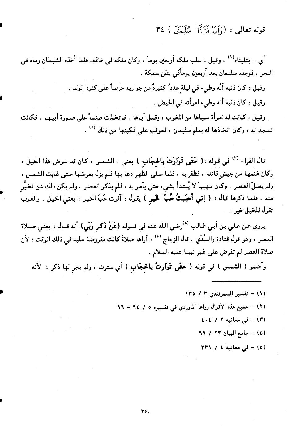 قال الفراء في قوله: (حَتَّى تَوَارَتْ بِالْحِجَابِ) يعني: الشمس، كان قد عرض هذا الخيل، وكان غنمها من جيش قاتله، فظفر به، فلما صلى الظهر دعا بها فلم يزل يعرضها حتى غابت الشمس، ولم يصل العصر، وكان مهيباً لا يُبتدأ بشيء حتى يأمر به، فلم يذكر العصر، ولم يكن ذلك عن تخُّيرٍ منه، فلمَّا ذكرها قال: (إِنِّي أَحْبَبْتُ حُبَّ الْخَيْرِ)؛ يقول: آثرت حُبَّ الخير: يعني الخيل، والعرب تقول للخيل خير.