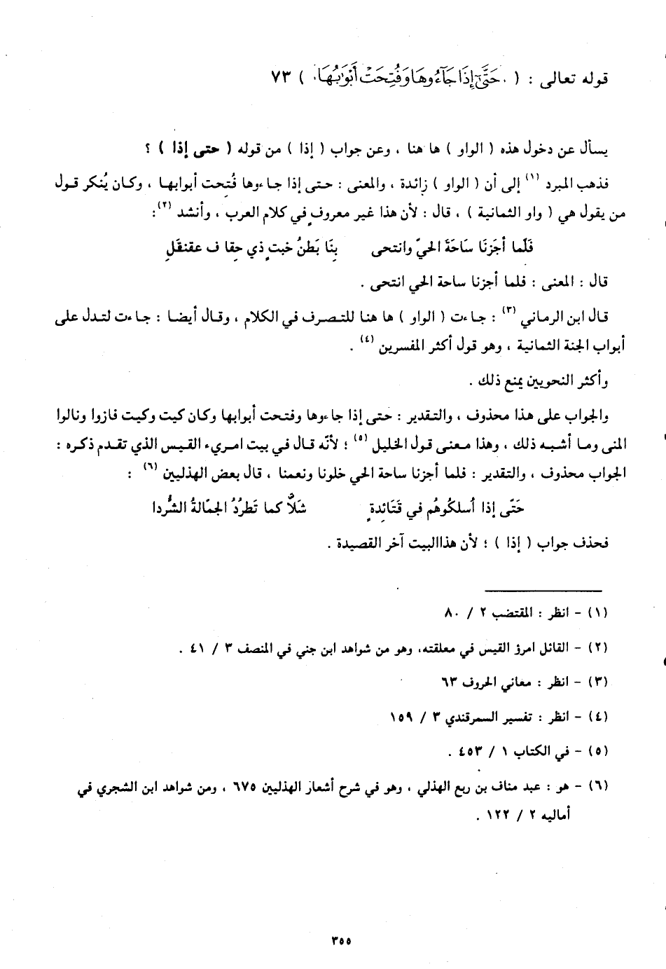 فذهب المبرد إلى أنّ (الواو) زائدة، والمعنى: حتى إذا جاءوها فُتِحت أبوابها. وكان يُنكر قول من يقول هي (واو الثمانية)، قال: لأنّ هذا غير معروفٍ في كلام العرب. وأنشد: