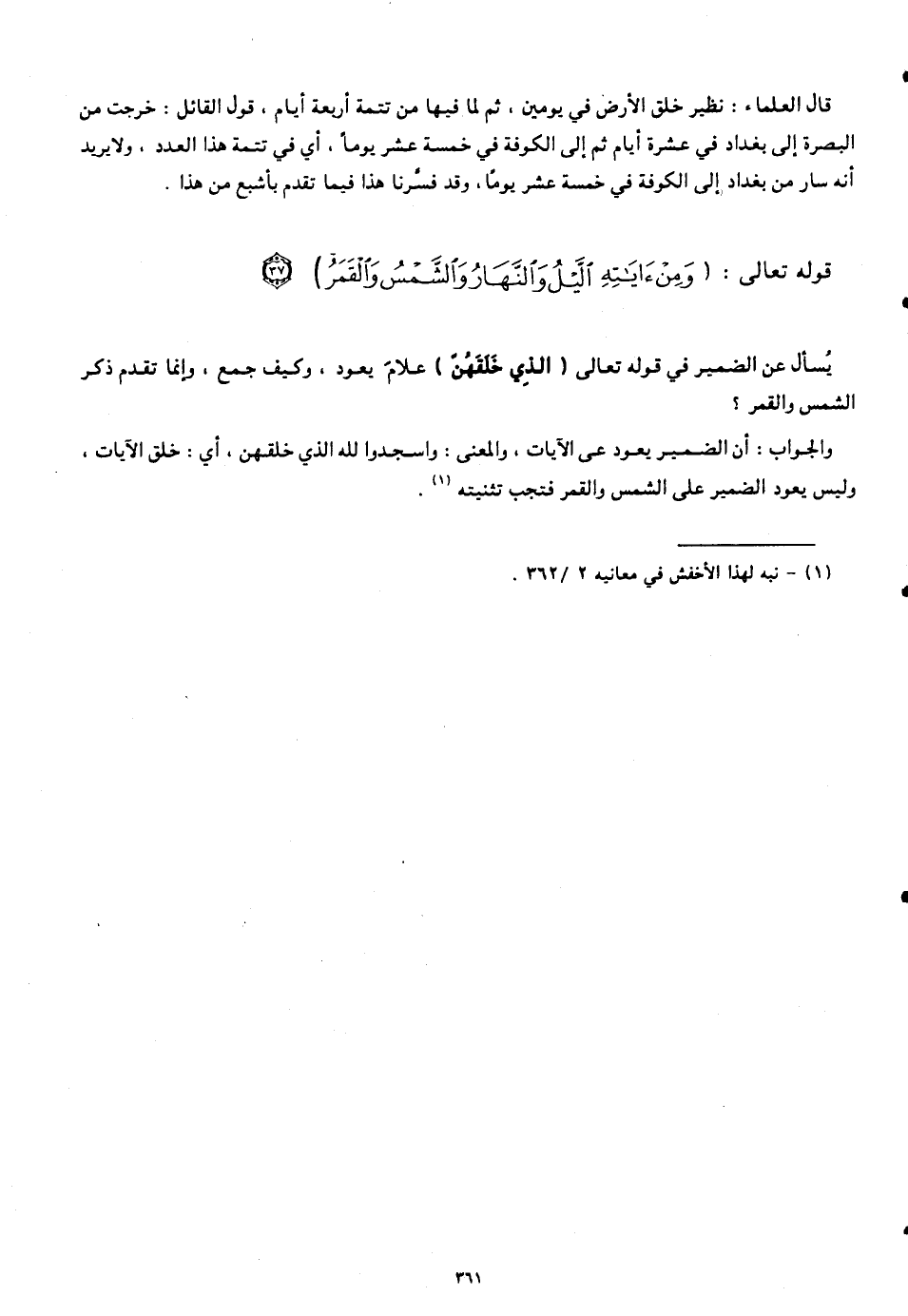 قال العلماء: نظير خلق الأرض في يومين. ثم لما فيها من تتمة أربعة أيام، قول القائل: خرجت من البصرة إلى بغداد في عشرة أيام ثم إلى الكوفة في خمسة عشر يوماً. أي في تتمة هذا العدد، ولا يريد أنّه سار من بغداد إلى الكوفة في خمسة عشر يوماً، وقد فسَّرنا هذا فيما تقدم بأشبع من هذا.