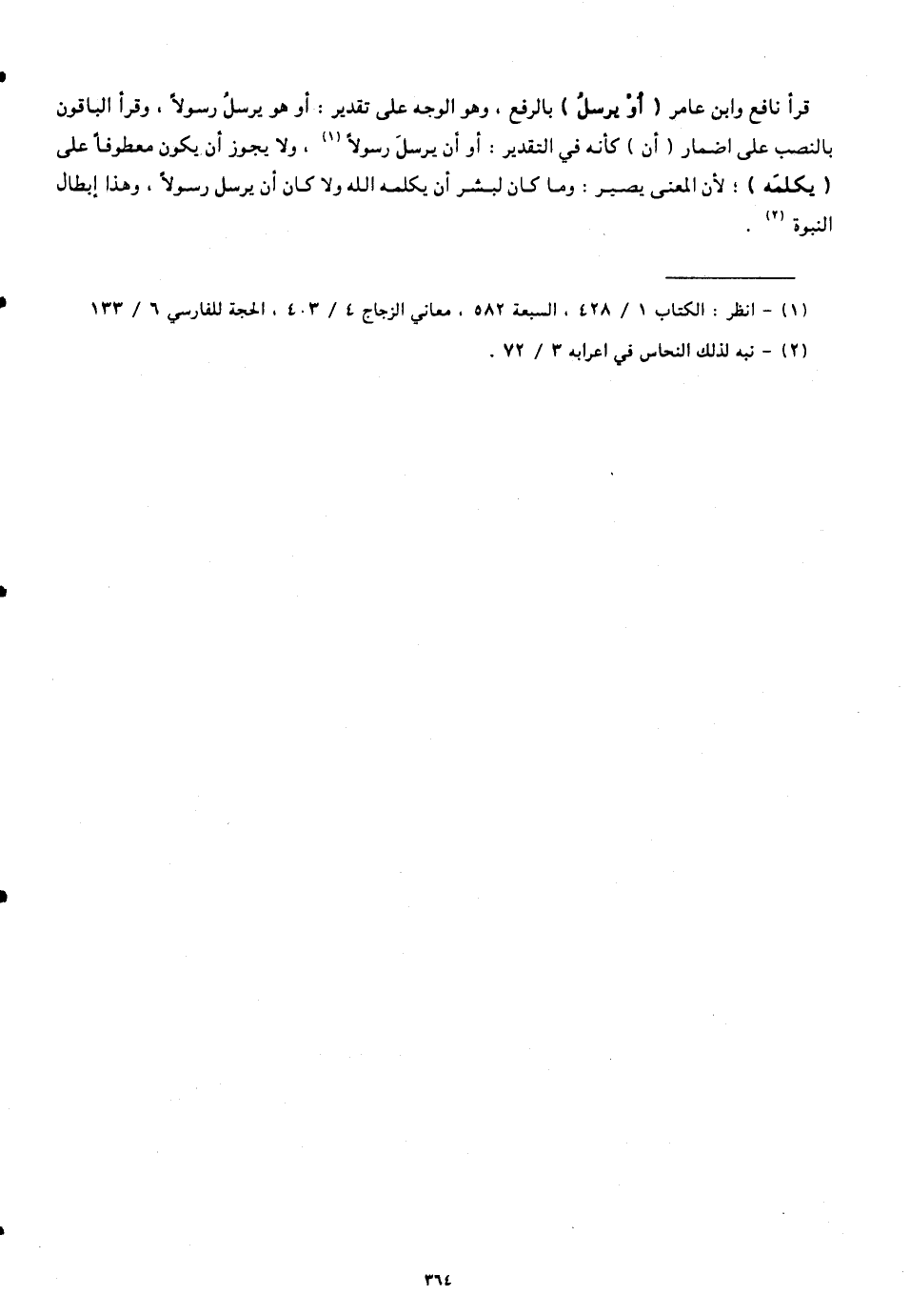 قرأ نافع وابن عامر (أَوْ يُرْسِلُ) بالرفع، وهو الوجه على تقدير: أو هو يرسلُ رسولًا. وقرأ الباقون بالنصب على إضمار (أنّ) كأنّه في التقدير: أو أن يرسلَ رسولًا، ولا يجوز أن يكون معطوفاً على (يُكَلِّمَهُ)؛ لأنّ المعنى يصير: وما كان لبشر أن يكلمه الله ولا كان أن يرسل رسولًا، وهذا إبطال النبوة.
