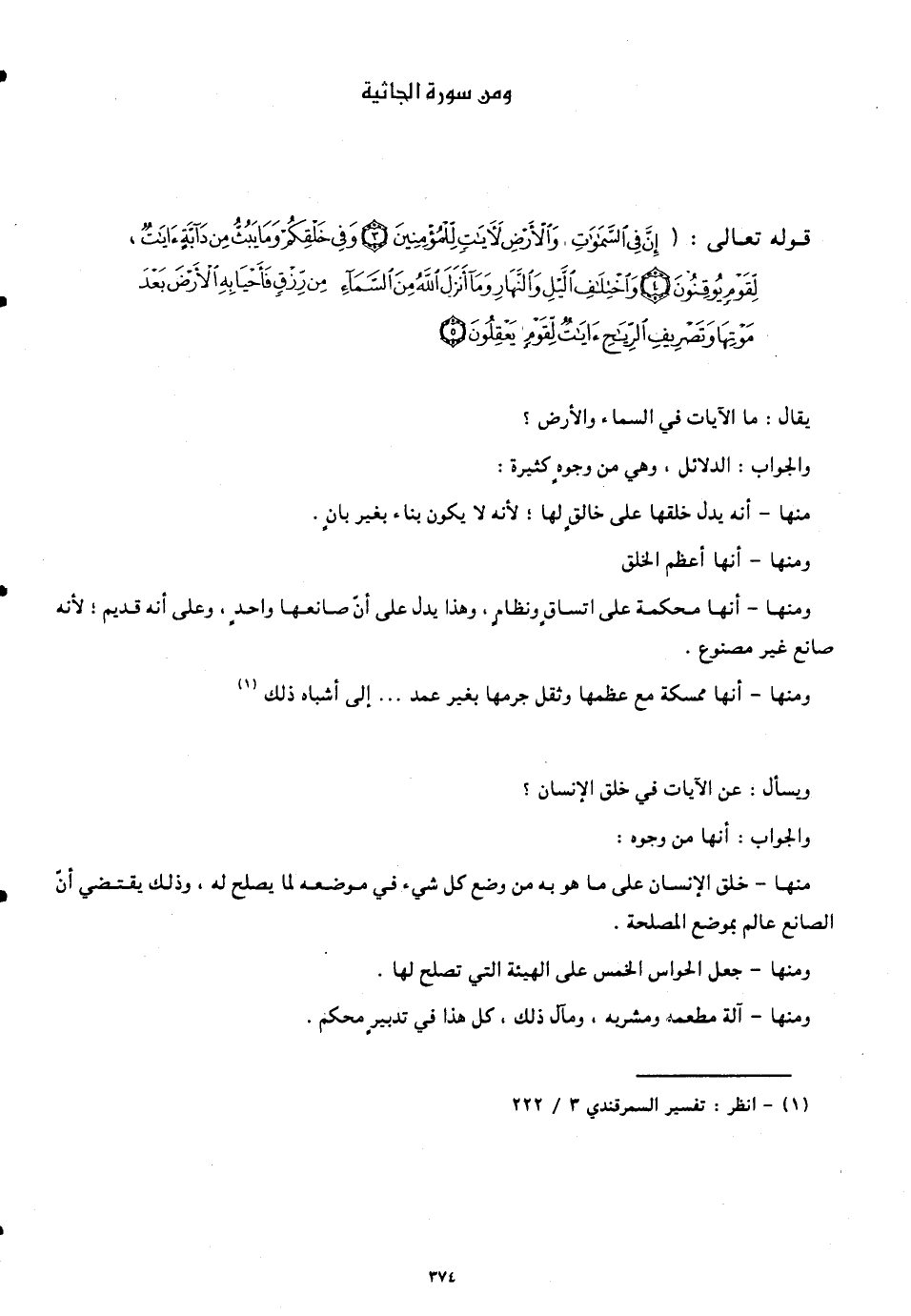 قوله تعالى: (إِنَّ فِي السَّمَاوَاتِ وَالْأَرْضِ لَآيَاتٍ لِلْمُؤْمِنِينَ (3) وَفِي خَلْقِكُمْ وَمَا يَبُثُّ مِنْ دَابَّةٍ آيَاتٌ لِقَوْمٍ يُوقِنُونَ (4) وَاخْتِلَافِ اللَّيْلِ وَالنَّهَارِ وَمَا أَنْزَلَ اللَّهُ مِنَ السَّمَاءِ مِنْ رِزْقٍ فَأَحْيَا بِهِ الْأَرْضَ بَعْدَ مَوْتِهَا وَتَصْرِيفِ الرِّيَاحِ آيَاتٌ لِقَوْمٍ يَعْقِلُونَ (5)