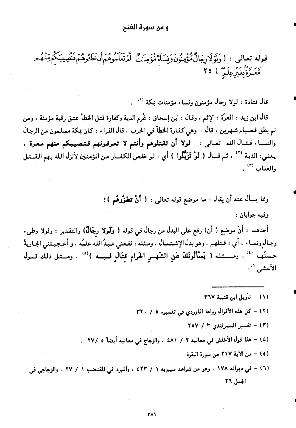 قوله تعالى: (وَلَوْلَا رِجَالٌ مُؤْمِنُونَ وَنِسَاءٌ مُؤْمِنَاتٌ لَمْ تَعْلَمُوهُمْ أَنْ تَطَئُوهُمْ فَتُصِيبَكُمْ مِنْهُمْ مَعَرَّةٌ بِغَيْرِ عِلْمٍ)