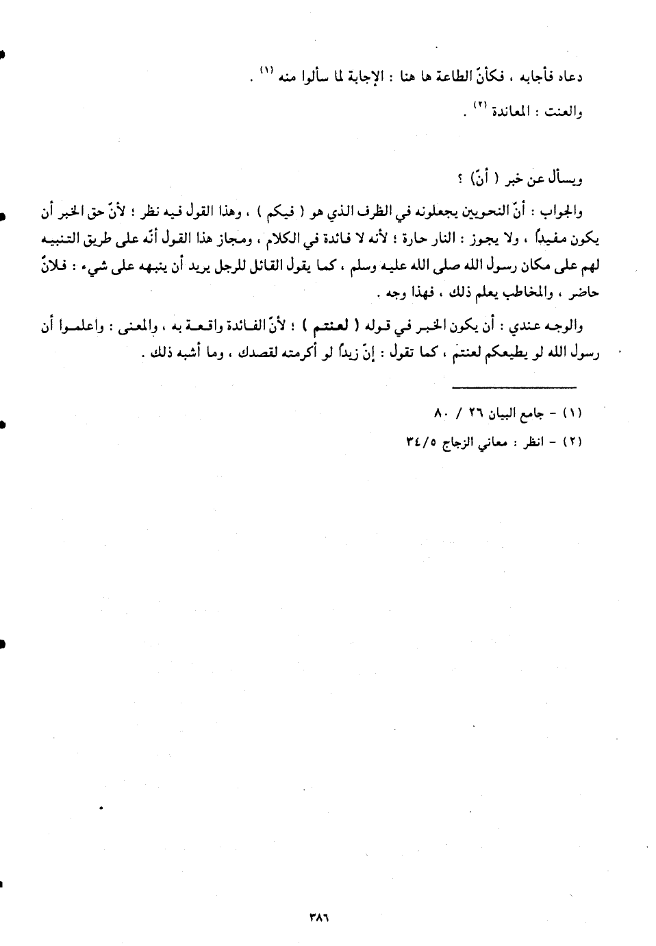 والوجه عندي: أن يكون الخبر في قوله (لعنتم)؛ لأنّ الفائدة واقعة به، والمعنى: واعلموا أنّ رسول الله لو يطيعكم لعنتنم، كما تقول: إنّ زيدًا لو أكرمته لقصدك، وما أشبه ذلك.