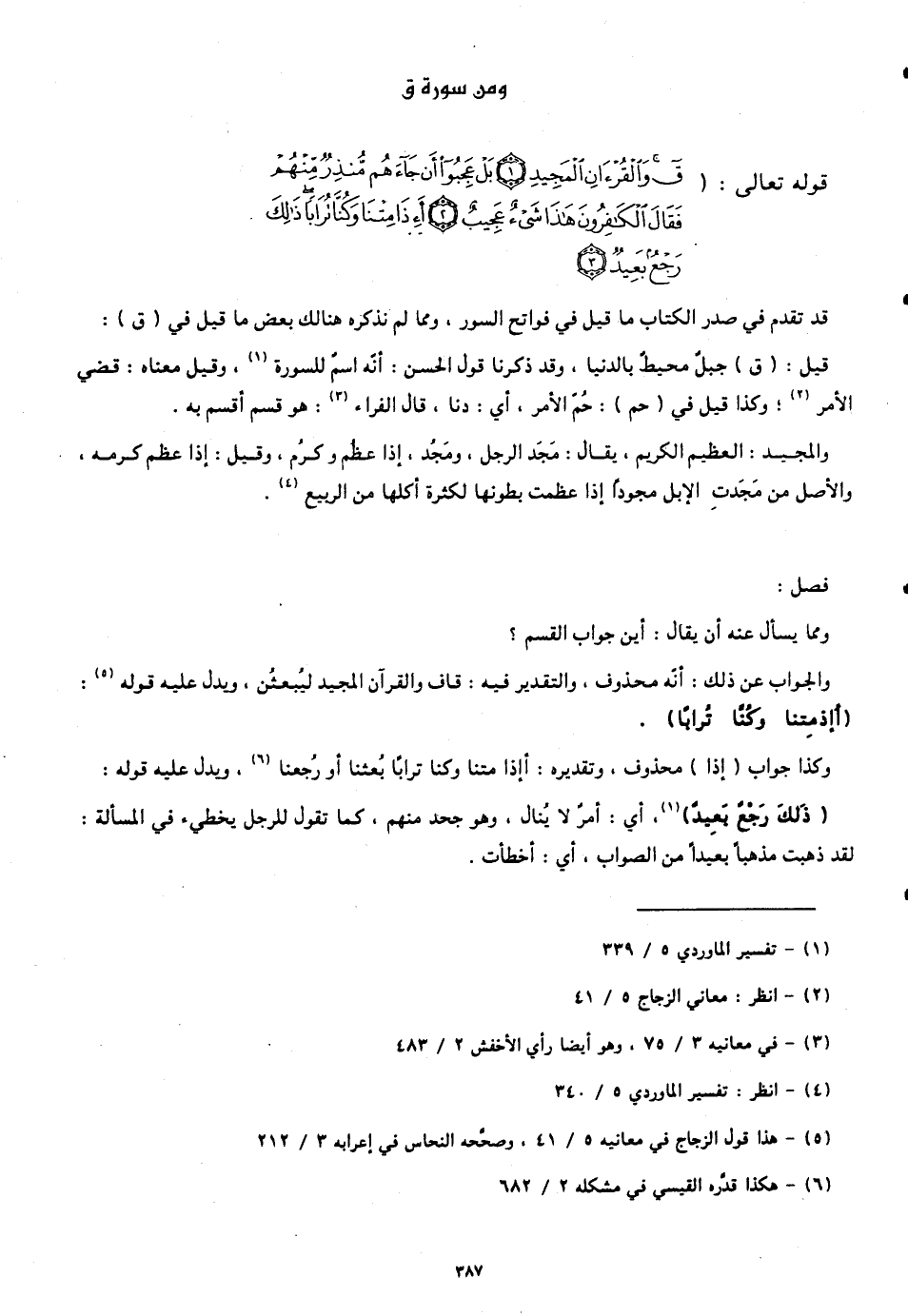 والجواب عن ذلك: أنّه محذوف. والتقدير فيه: قاف والقرآن المجيد ليُبعثُنَّ، ويدل عليه قوله: (أَإِذَا مِتْنَا وَكُنَّا تُرَابًا).