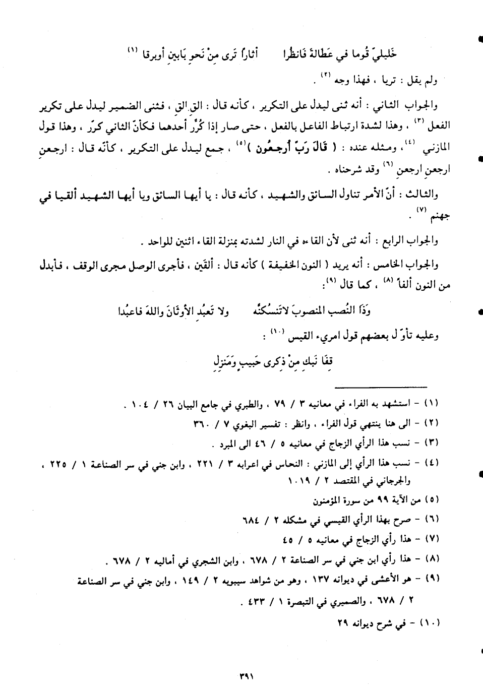 والجواب الخامس: أنّه يريد (النون الخفيفة) كأنّه قال: ألقَين. فأجرى الوصل مجرى الوقف، فأبدل من النون ألفاً، كما قال: