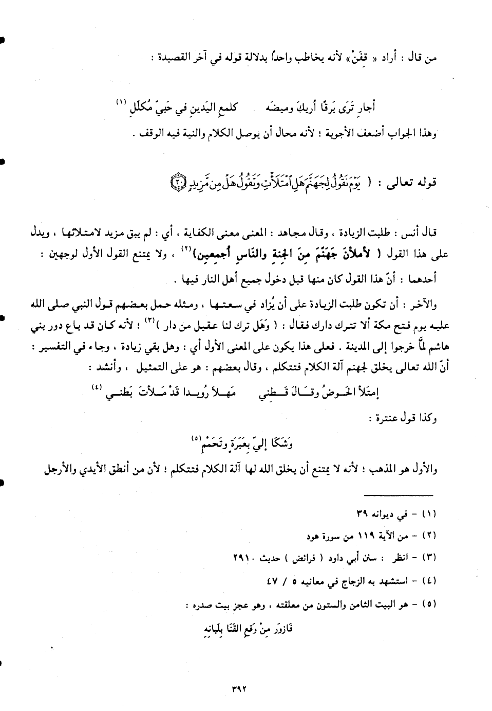 والآخر: أن تكون طلبت الزيادة على أن يُزاد في سعتها، ومثله حمل بعضهم قول النبي صلى الله عليه يوم فتح مكة ألا تترك دارك فقال: (وَهَل ترك لنا عقيل من دار)؛ لأنَّه كان قد باع دور بني هاشم لمَّا خرجوا إلى المدينة. فعلى هذا يكون على المعنى الأول أي: وهل بقي زيادة، وجاء في التفسير: أنّ الله تعالى يخلق لجهنم آلة الكلام فتتكلم، وقال بعضهم: هو على التمثيل، وأنشد: