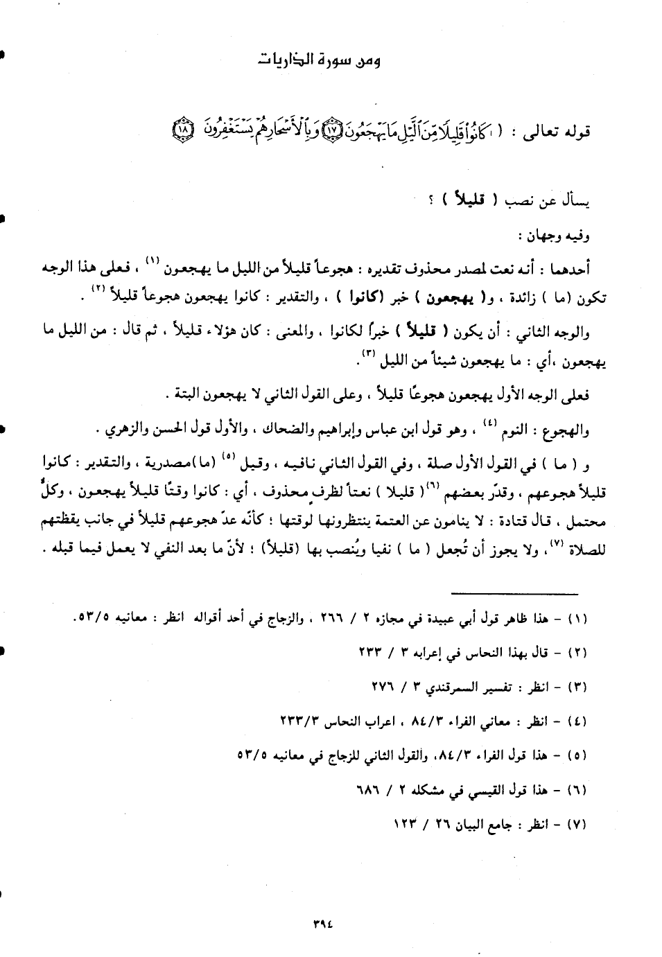 و (ما) في القول الأول صلة. وفي القول الثاني نافية، وقيل (ما) مصدرية، والتقدير: كانوا قليلًا هجوعهم، وقدَّر بعضهم (قليلا) نعتًا لظرفٍ محذوف، أي: كانوا وقتًا قليلًا يهجعون، وكلُّ محتمل. قال قتادة: لا ينامون عن العتمة ينتظرونها لوقتها؛ كأنّه عدَّ هجوعهم قليلًا في جانب يقظتهم للصلاة، ولا يجوز أن تُجعل (ما) نفيا وينصب بها (قليلاً)؛ لأنَّ ما بعد النفي لا يعمل فيما قبله.