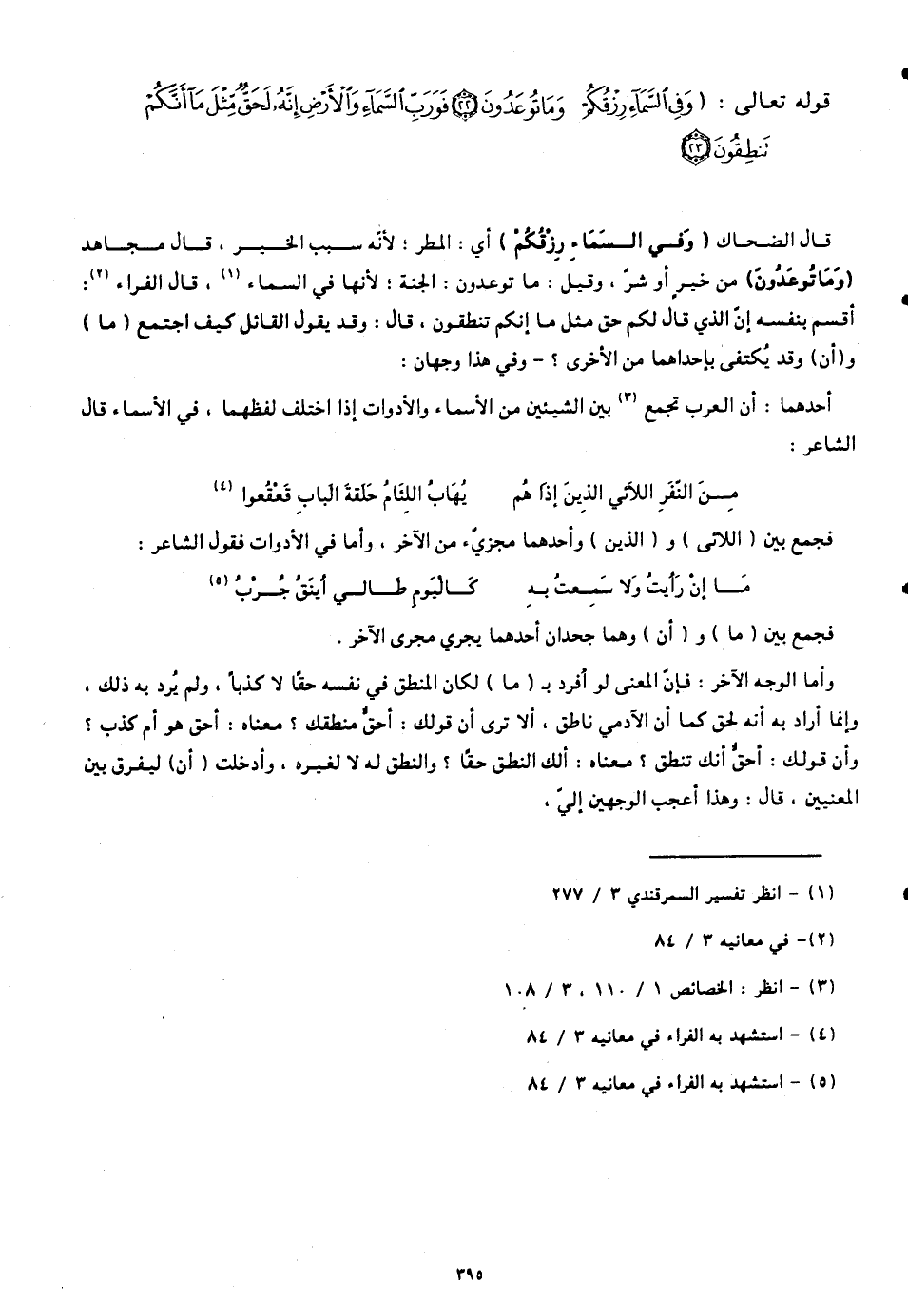 قال الضحاك (وَفِي السَّمَاءِ رِزْقُكُمْ) أي: المطر؛ لأنّه سبب الخير، قال مجاهد (وَمَا تُوعَدُونَ) من خير أو شر. وقيل: ما توعدون: الجنة، لأنها في السماء، قال الفراء: أقسم بنفسه إن الذي قال لكم حق مثل ما إنكم تنطقون، قال: وقد يقول القائل كيف اجتمع (ما) و (أنّ) وقد يُكتفى بإحداهما من الأخرى؟ وفي هذا وجهان: