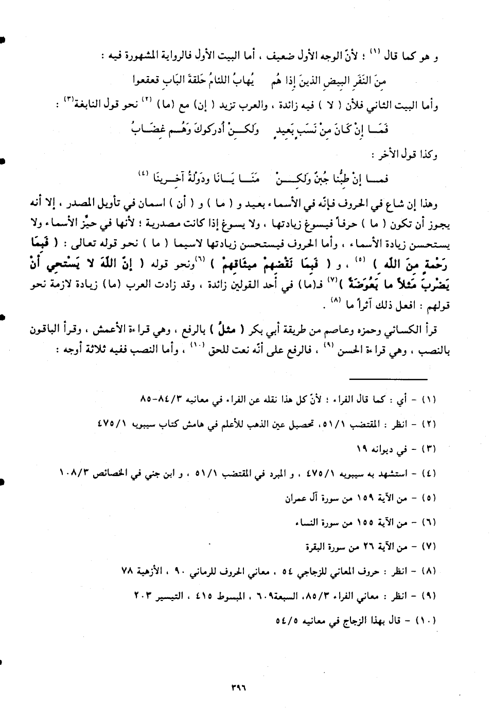 وهذا إن شاع في الحروف فإنَّه في الأسماء بعيد و (ما) و (أنّ) اسمان في تأهيل المصدر، إلا أنّه يجوز أن تكون (ما) حرفاً فيسوغ زيادتها، ولا يسوغ إذا كانت مصدرية؛ لأنها في حيز الأسماء ولا يستحسن زيادة الأسماء. وأما الحروف فيستحسن زيادتها لاسيما (ما) نحو قوله تعالى: (فَبِمَا رَحْمَةٍ مِنَ اللَّهِ)، و (فَبِمَا نَقْضِهِمْ مِيثَاقَهُمْ) ونحو قوله (إِنَّ اللَّهَ لَا يَسْتَحْيِي أَنْ يَضْرِبَ مَثَلًا مَا بَعُوضَةً) فـ (ما) في أحد القولين زائدة، وقد زادت العرب (ما) زيادة لازمة نحو قولهم: افعل ذلك آثراً ما.