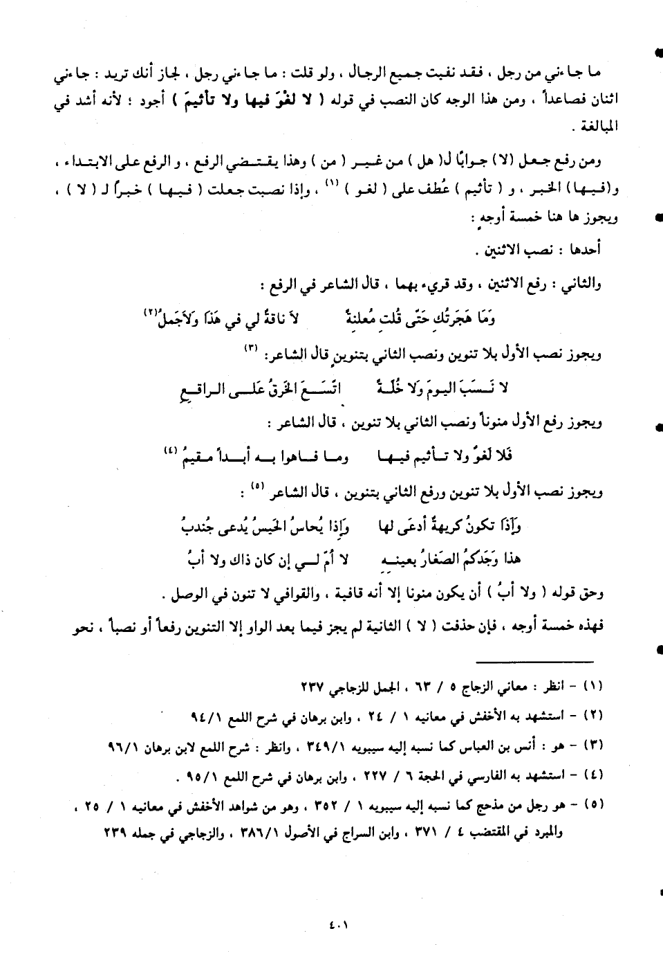 فهذه خمسة أوجه. فإن حذفت (لا) الثانية لم يجز فيما بعد الواو إلا التنوين رفعاً أو نصباً، نحو