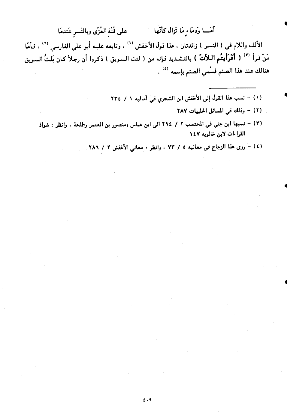 الألف واللام في (النسر) زائدتان، هذا قول الأخفش، وتابعه عليه أبو علي الفارسي، فأمْا مَن قرأ (أَفَرَأَيْتُمُ اللَّاتَّ) بالتشديد فإنه من (لتت السويق) ذكروا أنّ رجلاً كان يَلتُّ السويق هنالك عند هذا الصنم فسُمي الصنم باسمه.