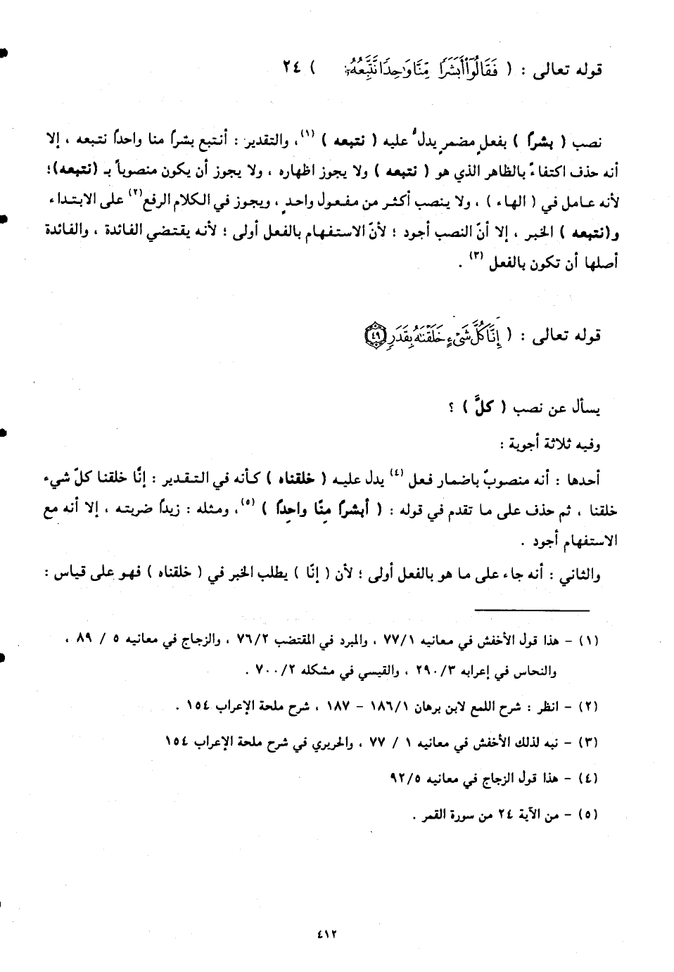 نصب (بَشَرًا) بفعلٍ مضمرٍ يدلُّ عليه (نَتَّبِعُهُ)، والتقدير: أنتبع بشرًا منا واحداً نتبعه، إلا أنّه حذف اكتفاءً بالظاهر الذي هو (نتبعه) ولا يجوز إظهاره، ولا يجوز أن يكون منصوباً ب (نَتَّبِعُهُ)؛ لأنّه عامل في (الهاء)، ولا ينصب أكثر من مفعول واحدٍ، ويجوز في الكلام الرفع على الابتداء و (نَتَّبِعُهُ) الخبر، إلا أنّ النصب أجود؛ لأنَّ الاستفهام بالفعل أولى؛ لأنّه يقتضي الفائدة، والفائدة أصلها أن تكون بالفعل.